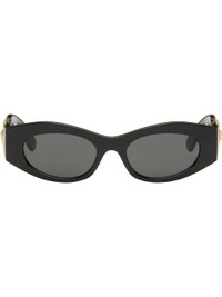 Cat-eye acetate-frame sunglasses. · Gray lenses · 100% UVA/UVB protection, category 3 · Integrated nose pads · Logo hardware at temples · Includes case · Size: 51.18 140 Supplier color: Black/Gold Acetate. Made in Italy 261404F005003