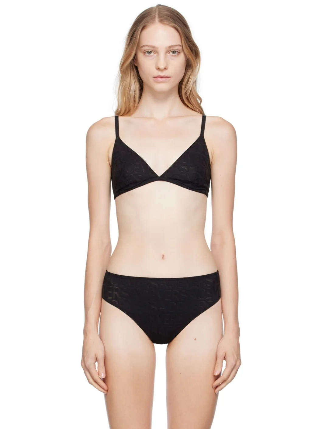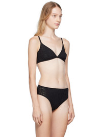 Semi-sheer stretch nylon mesh bra. Jacquard logo graphic throughout. · V-neck · Adjustable spaghetti straps · Adjustable hook-eye fastening at back Supplier color: Black 81% nylon, 19% elastane. Made in Italy 232653F073006