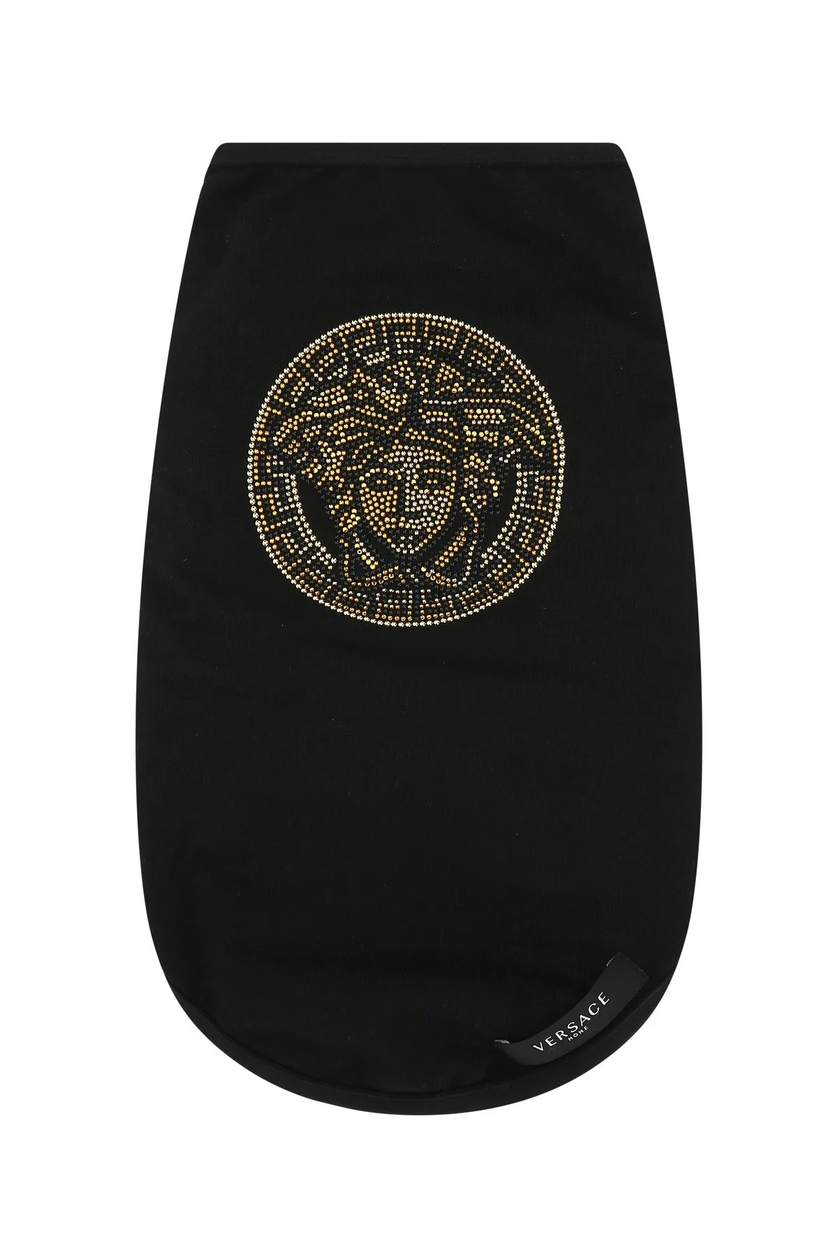 Dog t-shirt realized in stretch cotton characterized by iconic Medusa Head print with rhinestones enriched by logoed label. DETAILS Black stretch cotton dog t-shirt Exterior: 95% Cotton 5% Elastane Made in italy
