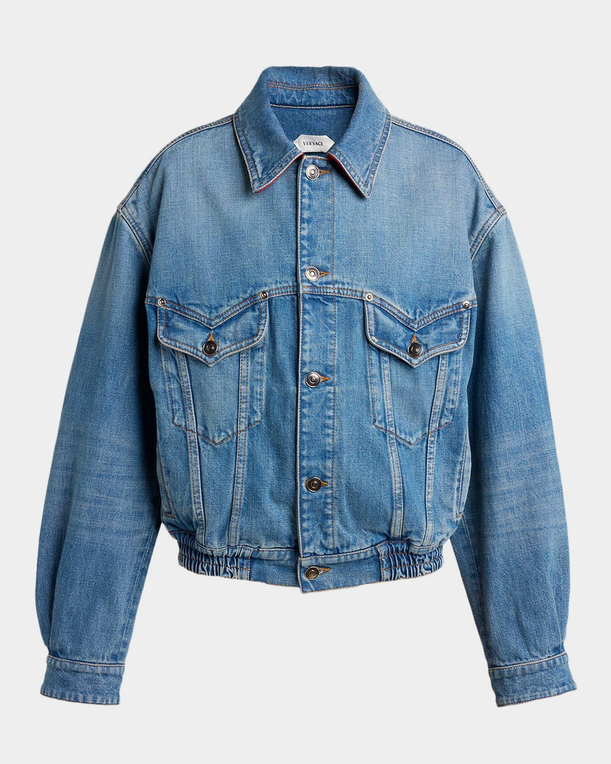 Lined with contrasting leather, this blouson jacket by Versace is designed in medium-wash denim with structured seams Point collar; button front Dropped shoulders Long sleeves; button cuffs Buttoned chest flap pockets Relaxed fit Elasticated hem Cotton/leather Made in Italy