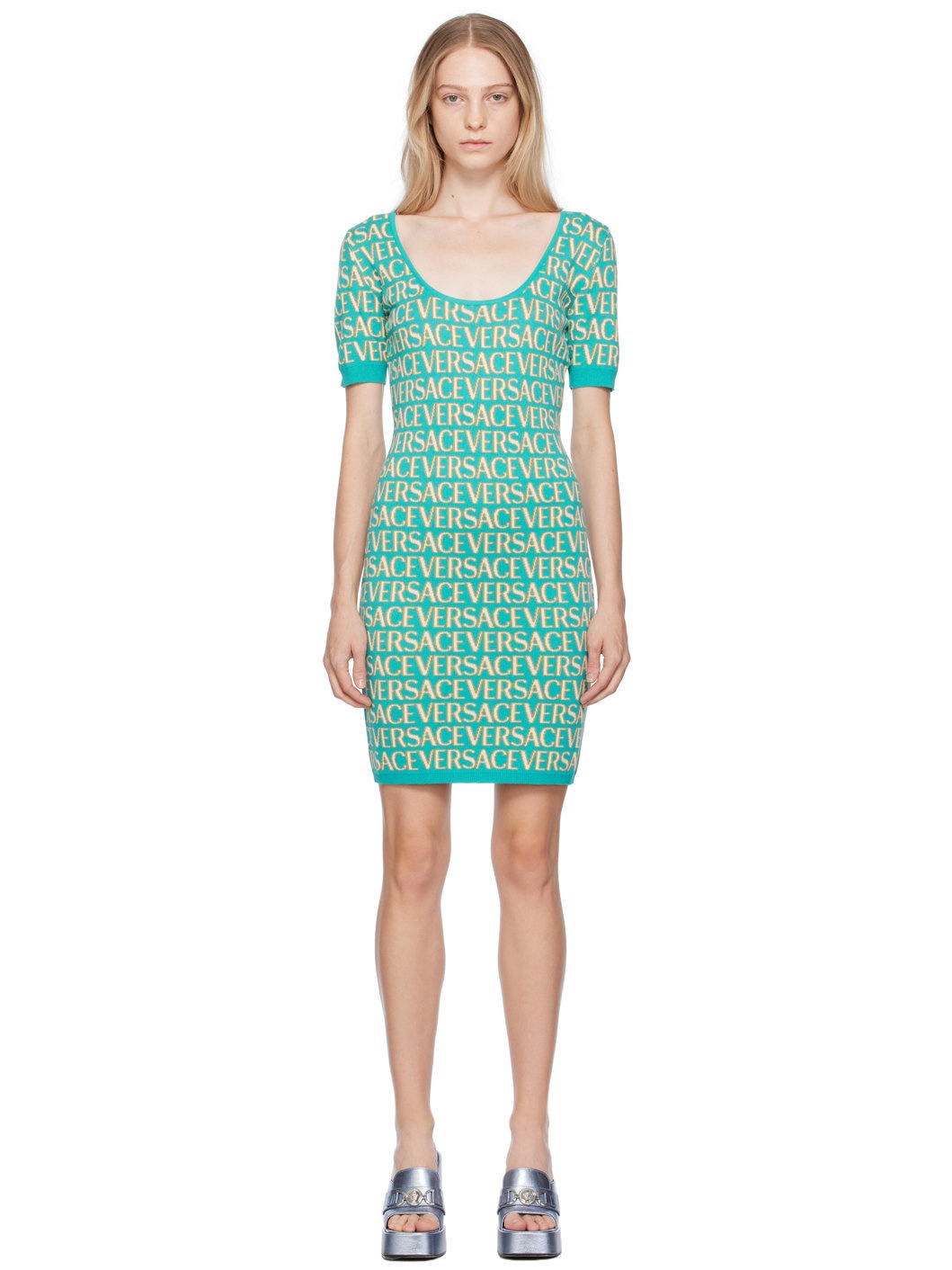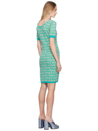 Knit cotton- and viscose-blend dress. · Jacquard logo pattern throughout · Rib knit scoop neck, hem, and cuffs Supplier color: Turquoise