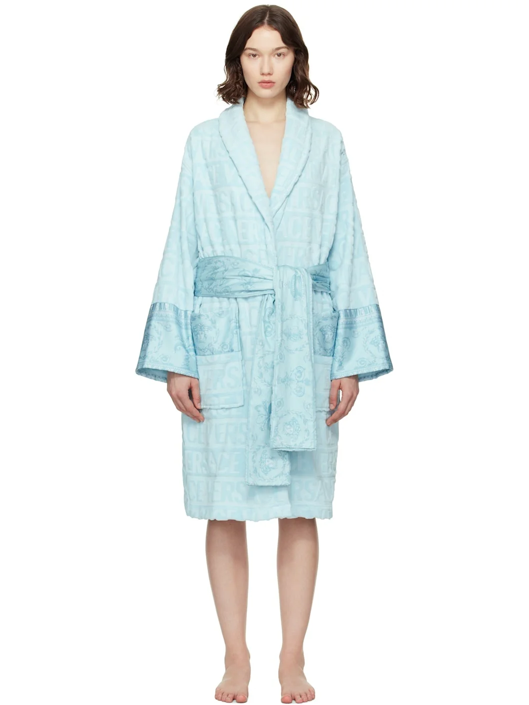 Cotton terrycloth bathrobe. Jacquard logo pattern and Barocco-patterned poplin trim throughout. · Shawl collar · Belt loops with detachable self-tie belt · Patch pockets at waist Supplier color: Pale blue 100% cotton. Made in Italy 252404F077008