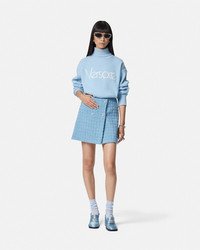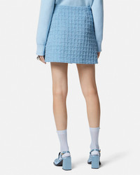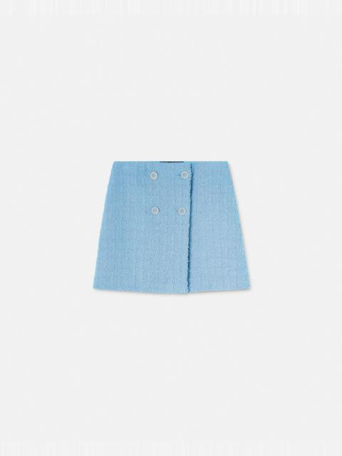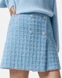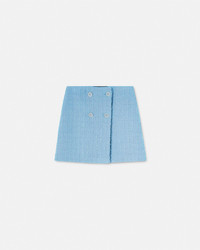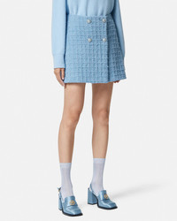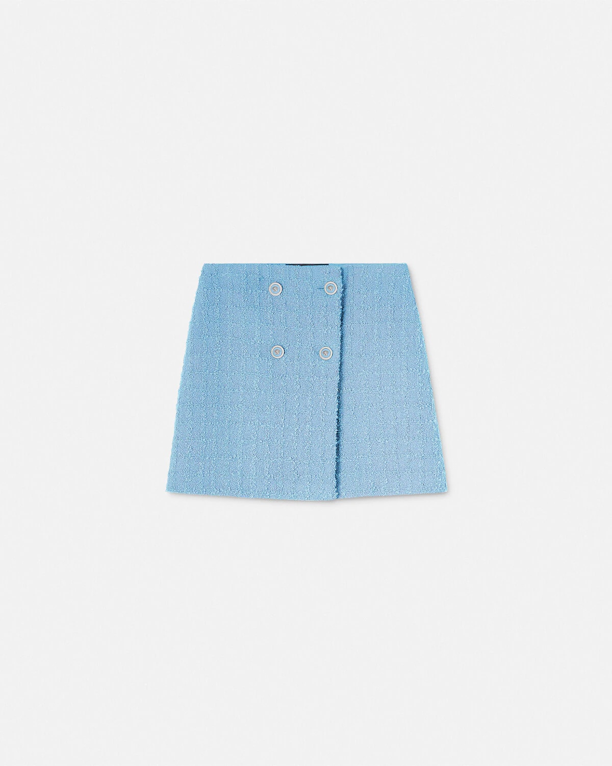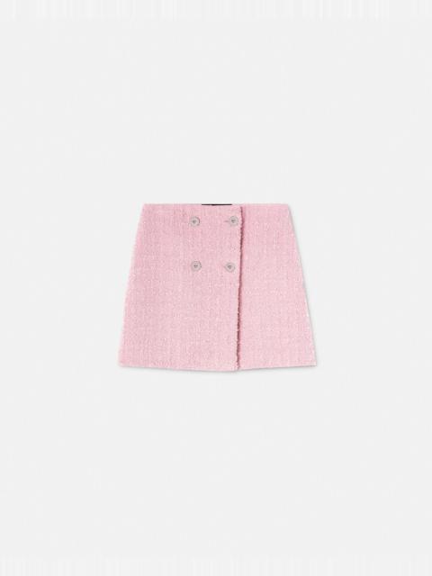 DETAILS This mini skirt in bouclé tweed features a wrap design with accent Medusa buttons. - Medusa hardware - Barocco jacquard lining - Outer composition: 77% Pure virgin wool, 14% Mohair, 9% Nylon - Lining: 58% Cupro, 42% Viscose Item: 1013471-1A10096_1VD50 SIZE & FIT - The model wears size 38 IT