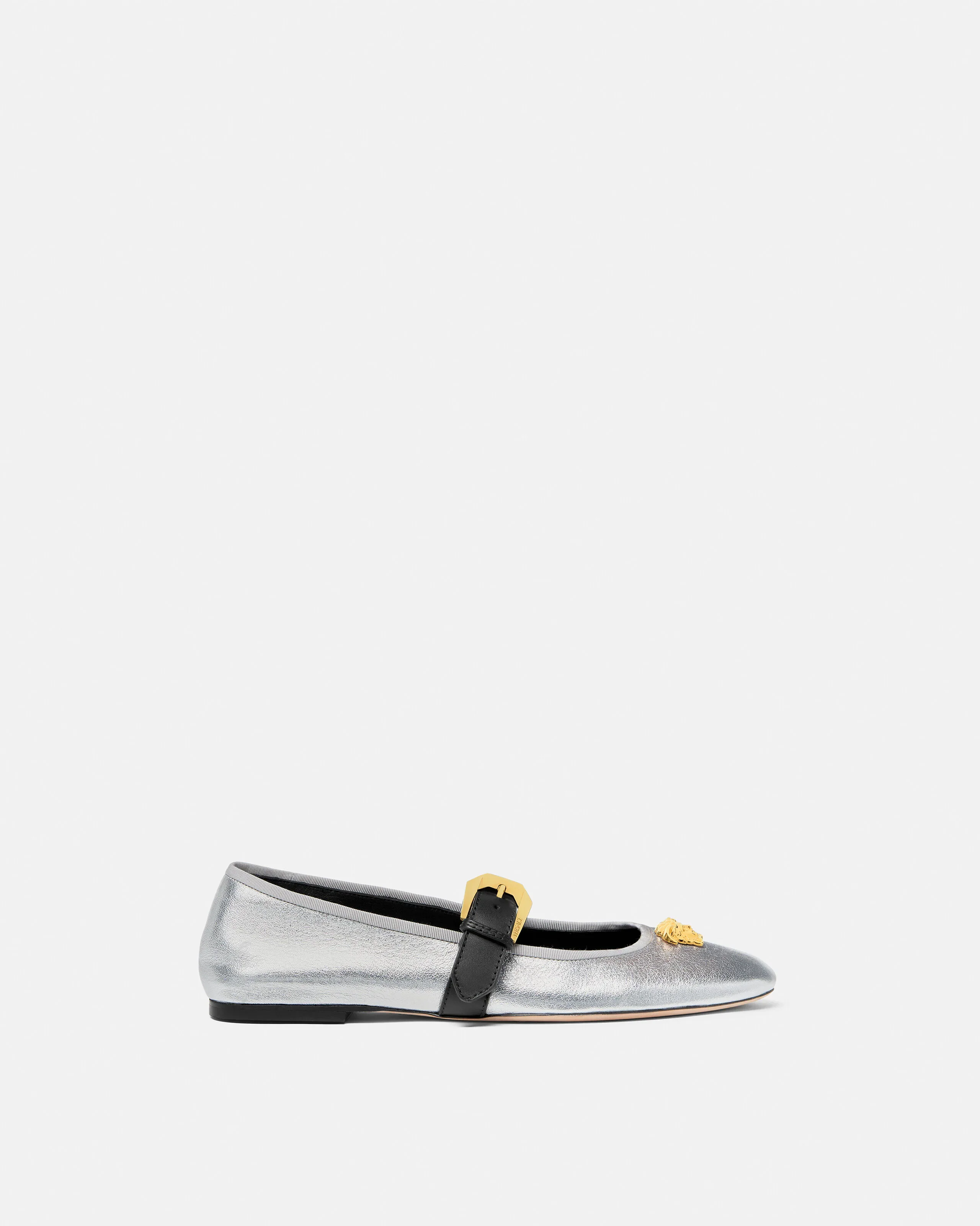 Ballerinas in metallic laminated calf leather featuring the signature three-dimensional La Medusa hardware and a Heritage buckle strap at the front. - La Medusa hardware - Heritage buckle - Round toe - Flat - Outer composition: 100% Lambskin - Lining 1: 100% Lambskin - Lining 2: 100% Lambskin - Trim 1: 100% Calf leather - Trim 2: 59% Viscose, 41% Cotton - Sole: 100% Calf leather Size & Fit - Footbed: comfortable - Fits true to size, take your normal size Item: 1021710-1A16241_2E94V