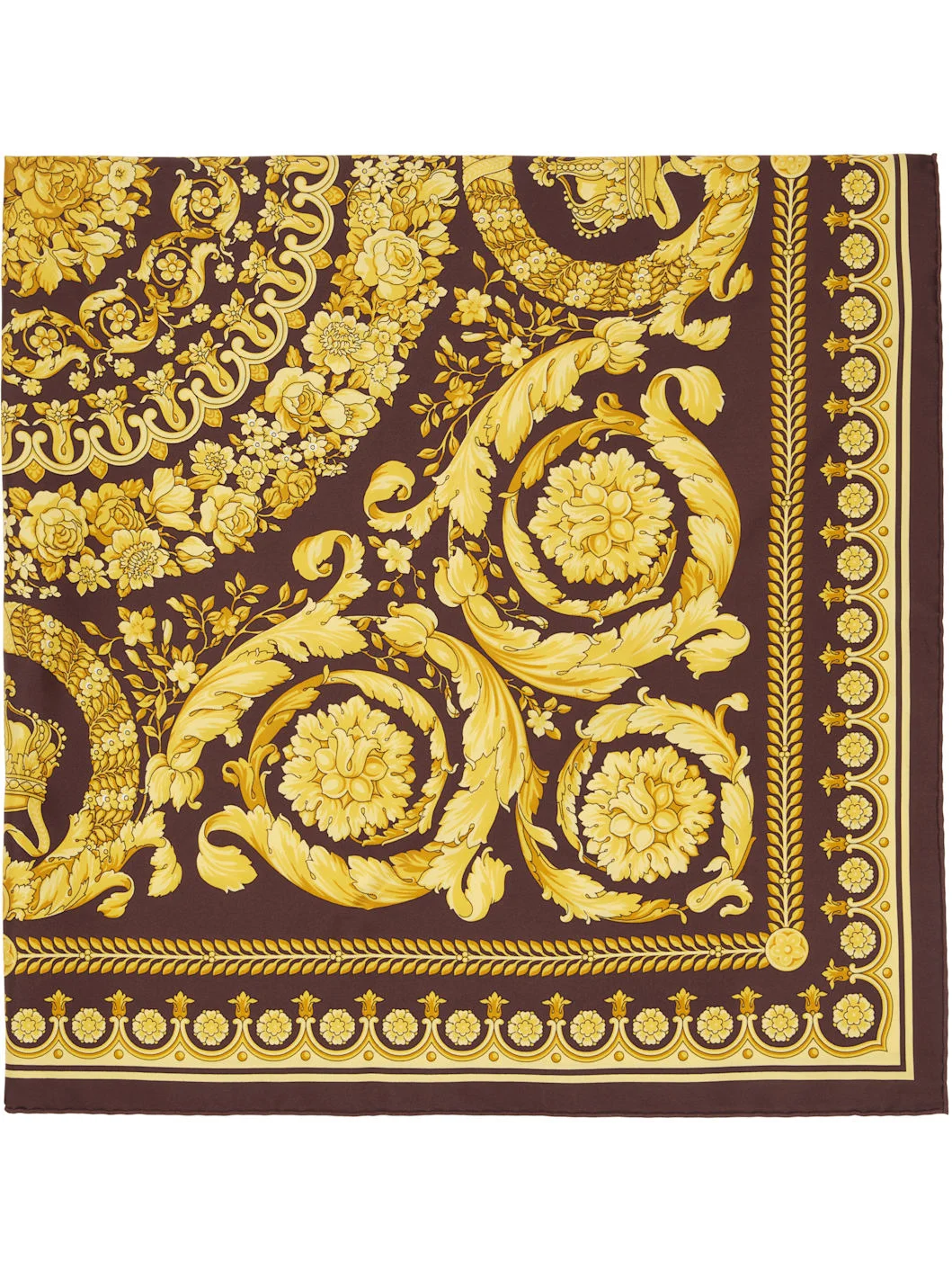 Square silk twill scarf. · Barocco logo pattern throughout · L35.5" x W35.5" Supplier color: Burgundy/Gold 100% silk. Made in Italy 261404F029002