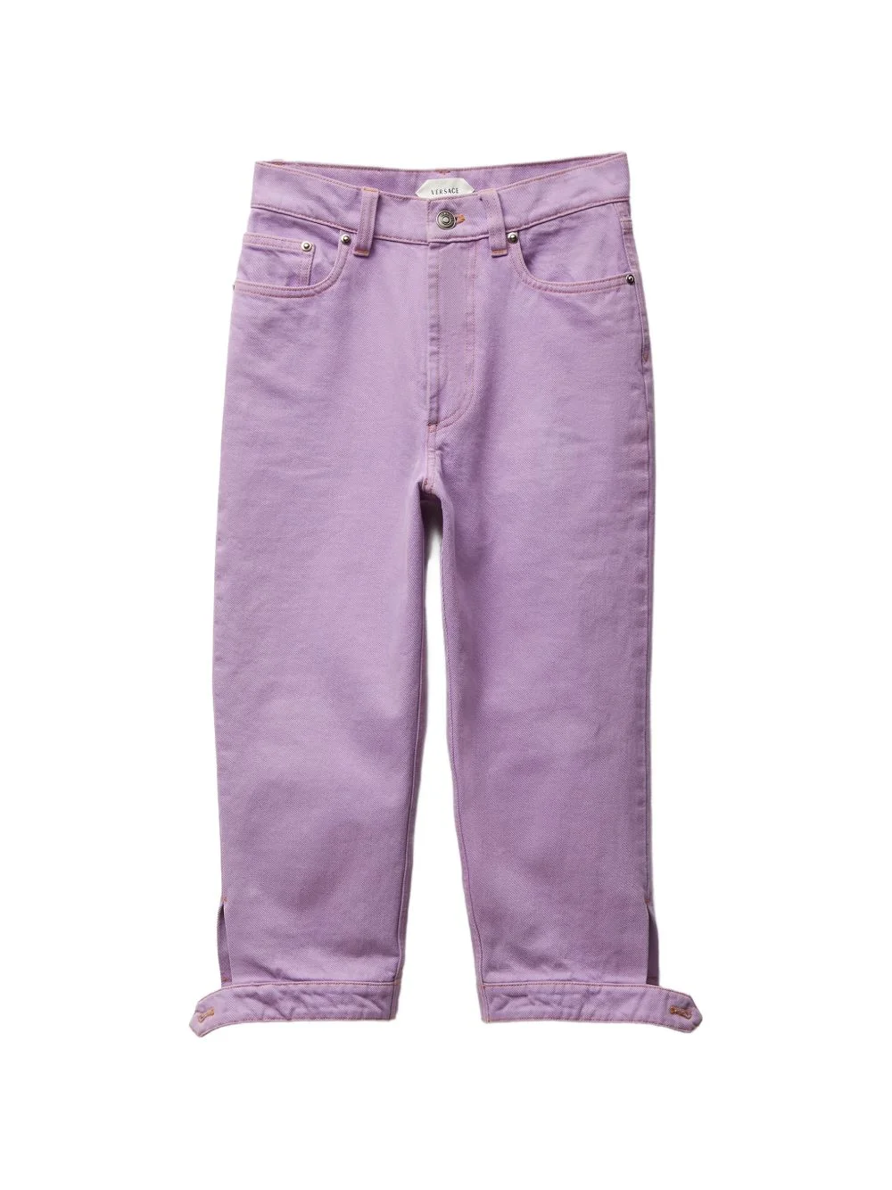 Capri jeans Highlights - Capri jeans in colored cotton denim featuring a regular waist, a five-pocket design, and a button detail at the hem. a leather patch details the back with an embossed versace logo and 3d medusa hardware. - Medusa hardware - Back leather patch - Belt loops - Front button and zip closure - Five-pocket design - Outer composition: 100% cotton - Lining: 100% cotton - Trim: 100% calf leather - The model is 1.75 m tall and wears size 38 it Imported Composition Cotton 100%, Calf Leather 100% Washing instructions Read Manufacturer Guidelines