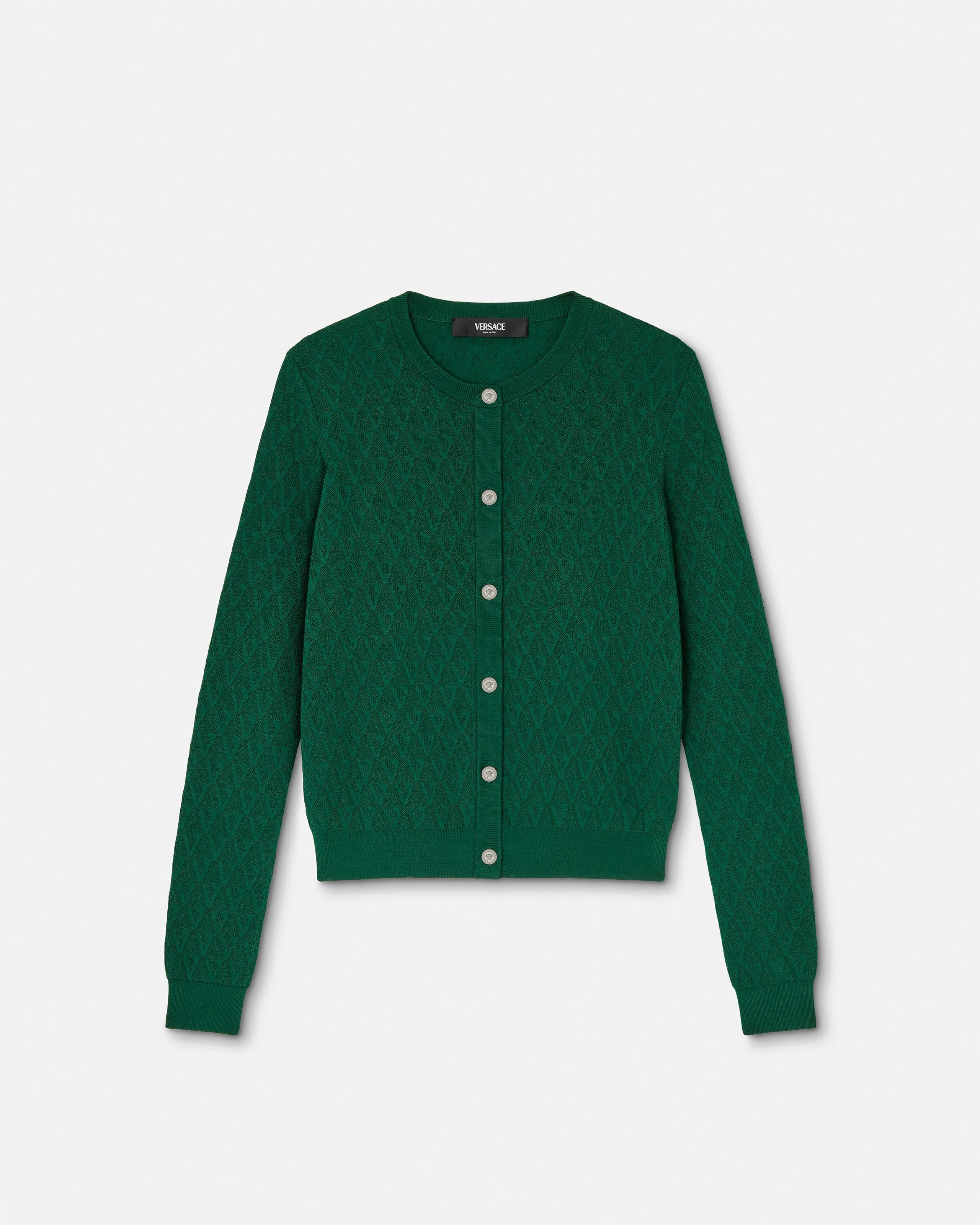 This long-sleeved crewneck fitted cardigan in a knit viscose features a tonal jacquard V Allover pattern and accent Medusa buttons. - V Allover pattern - Medusa buttons - Long sleeves - Crewneck - Ribbed trims - Outer composition: 91% Viscose, 7% Polyamide, 2% Elastane Size & Fit - The model is 5'9" / 1.76 m tall and wears size 38 IT Item: 1023014-1A15978_1GQ50