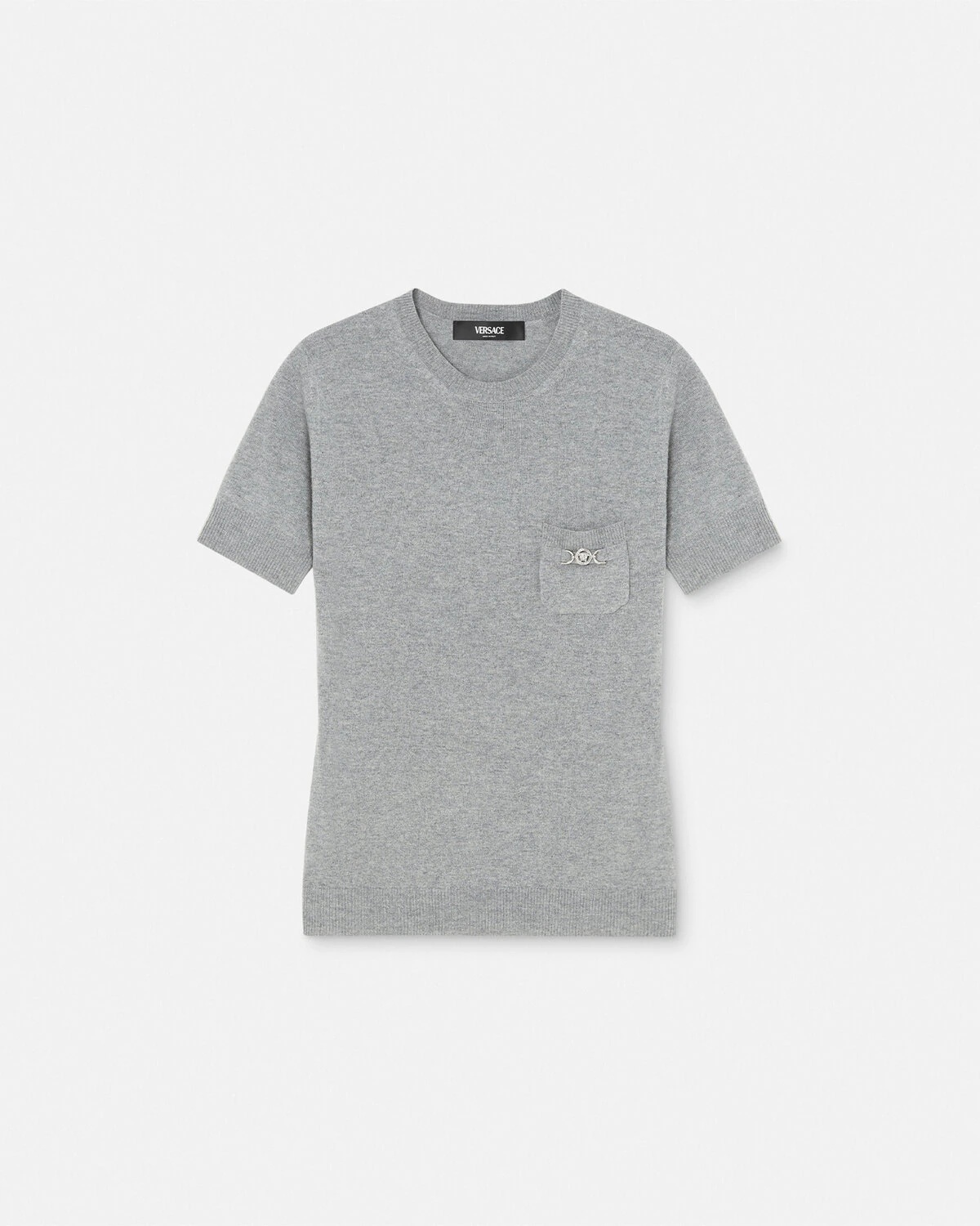 DETAILS This short-sleeved wool and cashmere-blend T-shirt is detailed with ribbed trims and accent Medusa '95 hardware. - Medusa '95 hardware - Short sleeves - Ribbed crewneck, hem, and cuffs - Outer composition: 70% Pure virgin wool, 30% Cashmere Item: 1016099-1A11287_1EB60 SIZE & FIT - The model is x'x" tall and wears size 38 - All sizes fit Italian standards