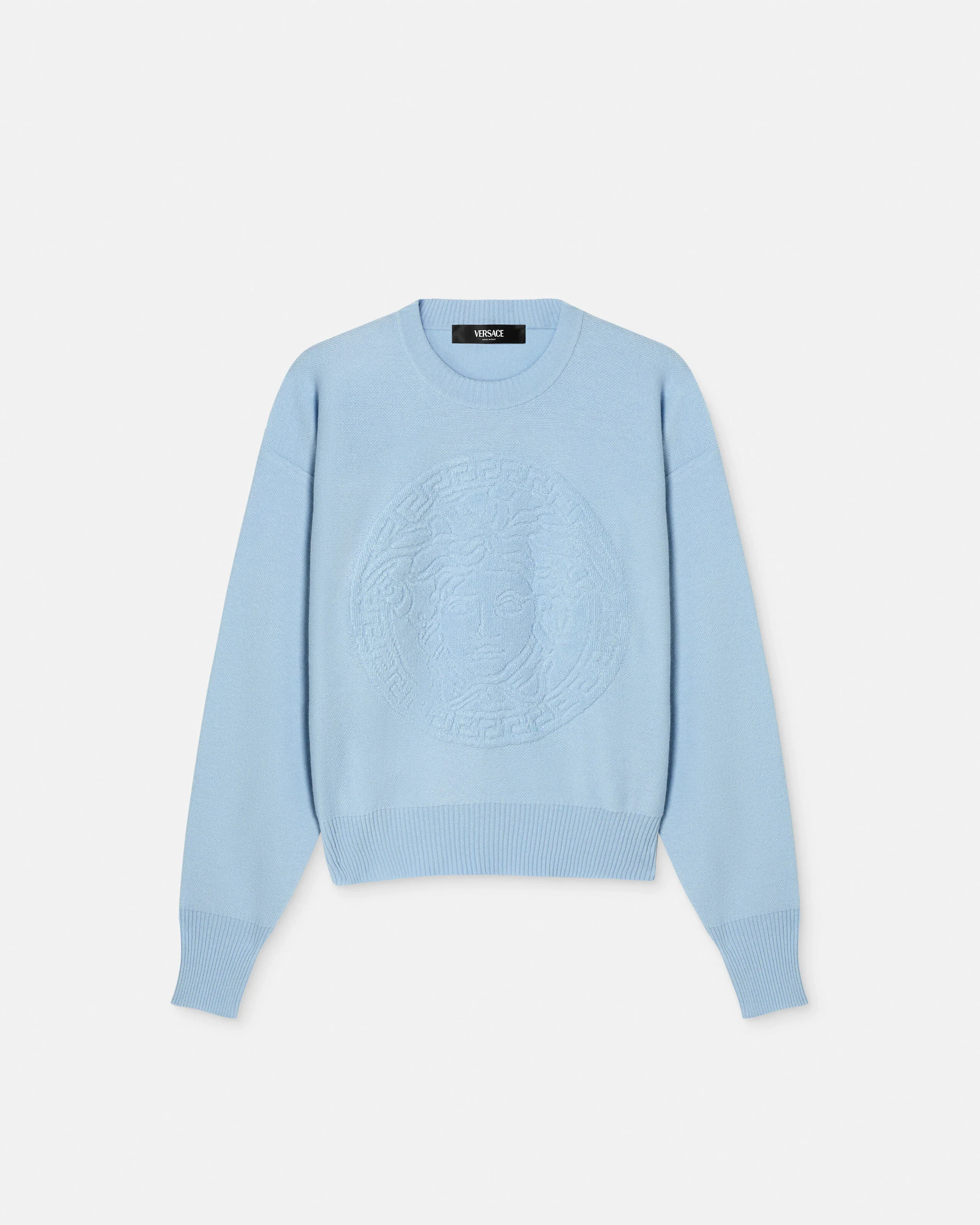 A wool and cashmere blend crewneck sweater featuring a terry toweling Medusa motif, ribbed trims, and relaxed dropped shoulders. - Medusa motif - Long sleeves - Crewneck - Ribbed trims - Outer composition: 70% Wool, 30% Cashmere - Yarn made from responsibly sourced wool Size & Fit - The model is 5'10" m tall and wears size 38 IT Item: 1013429-1A10005_1VD60