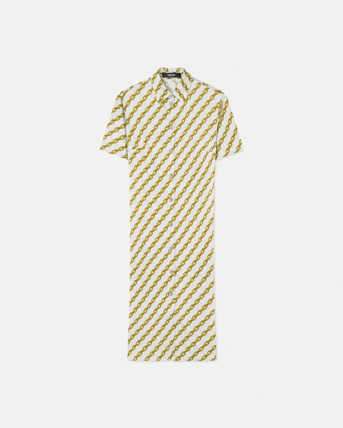 DETAILS This shortsleeved midi shirt dress in fluid jersey features oblique golden chain stripes with accent Medusa buttons - Gold Chain Stripes print - Medusa hardware - Short sleeves - Pointed collar - Front button closure - Outer composition: 100% Viscose Item: 1018503-1A13547_5E490 SIZE & FIT - The model is 5'10" / 1.79 m tall and wears size 38 IT