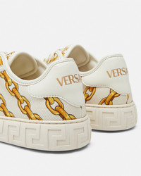 DETAILS These lowtop sneakers are characterized by an engraved Greca pattern on the soles and feature an allover printed chain motif and a foil Versace logo detail on the heel counter - Gold Chain Stripes print - Greca motif - Low-top - Lace-up - Round toe - Logo patch at the tongue - Logo on heel counter - Outer composition: 100% Cotton - Lining: 100% Polyester - Trim: 100% Polyester - Sole: 100% Thermoplastic polyurethane Item: 1013568-1A13792_5W73V SIZE & FIT - The shoe weighs approximately 14.1 oz / 0.4 kg for the model size 37 IT