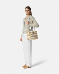 DETAILS Item: - Chain Stripes motif - La Medusa hardware - Versace Logo lettering - Double top handles - Two internal zipped pockets - Detachable and adjustable shoulder strap - Leather feet - Outer composition: 100% Cotton - Lining: 100% Cotton - Trim: 100% Calf leather Item: 1005861-1A13568_DTU_UNICA_5W73V__ SIZE & FIT - L11.6" x W5.7" x H9.4" / L29.5 x W14.5 x H24 cm - Handle drop: L5.1" / L13 cm - Shoulder strap: L33.1"-41" / L84-104 cm - Shoulder strap drop: L14.8"-22.6" / L37.5-57.5 cm - Approximate weight: 28 oz / 0.8 kg