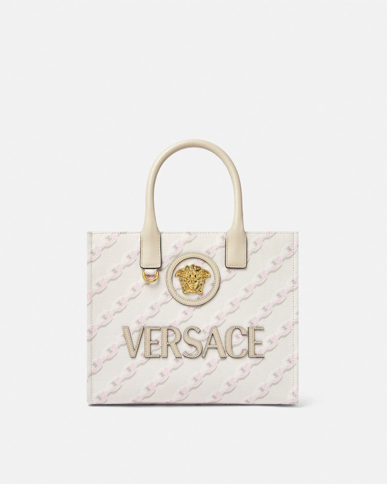 Crafted from canvas with leather top handles, this tote bag features an all-over pastel chain pattern and is detailed with a front Medusa hardware. It has a leather raised Versace Logo lettering and is complete with two zipped pockets and a leather protector strap. The style can be worn in-hand or on the shoulder for added versatility. The front D-ring provides an optional attachment for a keychain or charm. - Chain Stripes motif - La Medusa hardware - Versace Logo lettering - Double top handles - Two internal zipped pockets - Detachable and adjustable shoulder strap - Leather feet - Outer composition: 100% Cotton - Lining: 100% Cotton - Trim: 100% Calf leather Size & Fit - L11.6 x W5.7 x H9.4" / L29.5 x W14.5 x H24 cm - Handle drop: L5.1" / L13 cm - Shoulder strap: L33.1-40.9" / L84-104 cm - Shoulder strap drop: L14.8-22.6" / L37.5-57.5 cm - Approximate weight: 28.2 oz / 0.8 kg Item: 1005861-1A14138_DTU_UNICA_5K48V__