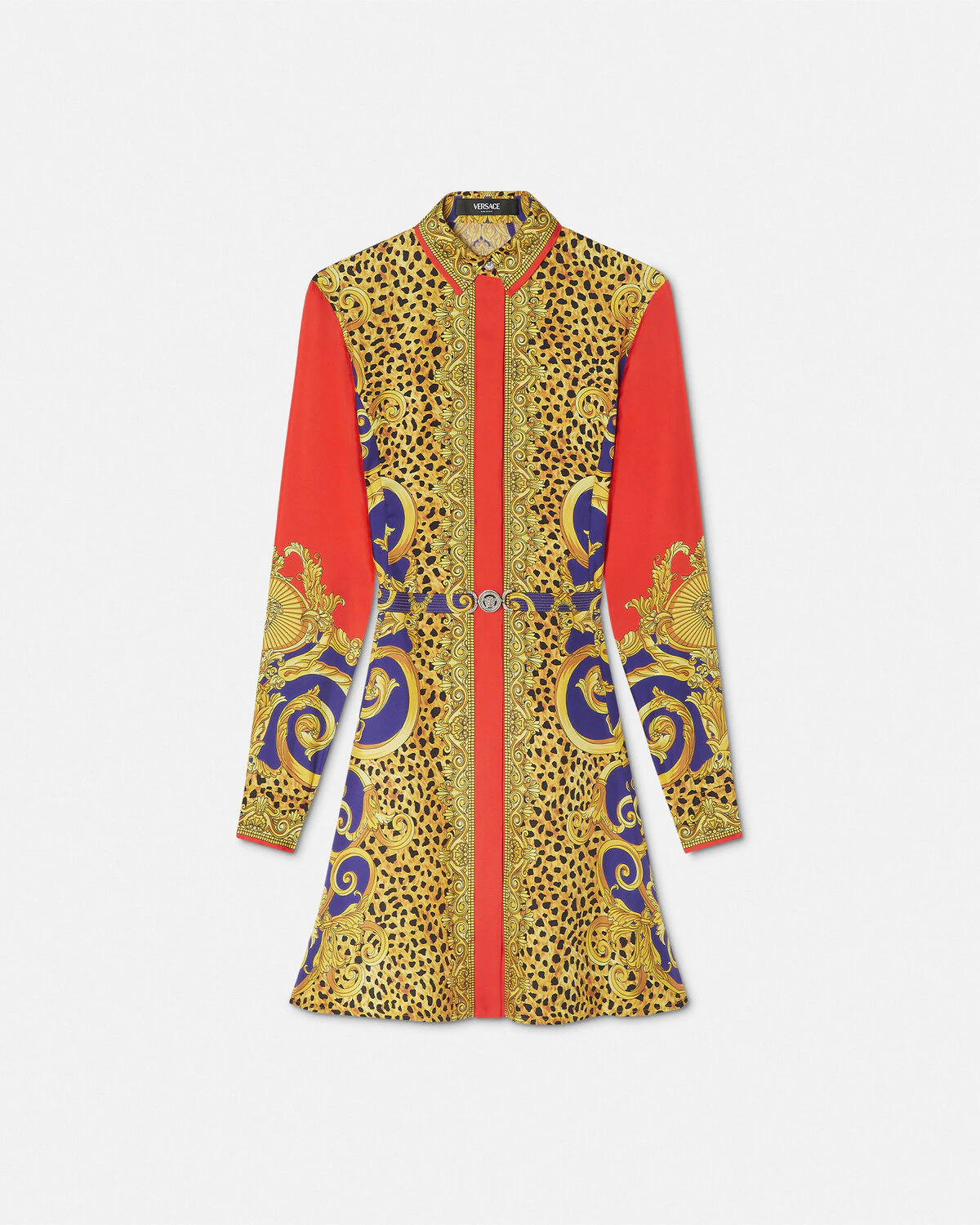 DETAILS This longsleeved midi shirt dress with a flared skirt is crafted from silk twill and features an animalier print with Barocco motifs A detachable Medusa 95 belt accents the waist - Cheetah Barocco Rock 'n' Royalty print - Medusa '95 hardware - Long sleeves - Pointed collar - Concealed front button placket - Buttoned cuffs - Detachable waist belt - Outer Composition: 100% Silk Item: 1018933-1A16367_5R730