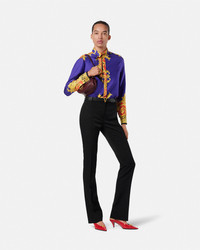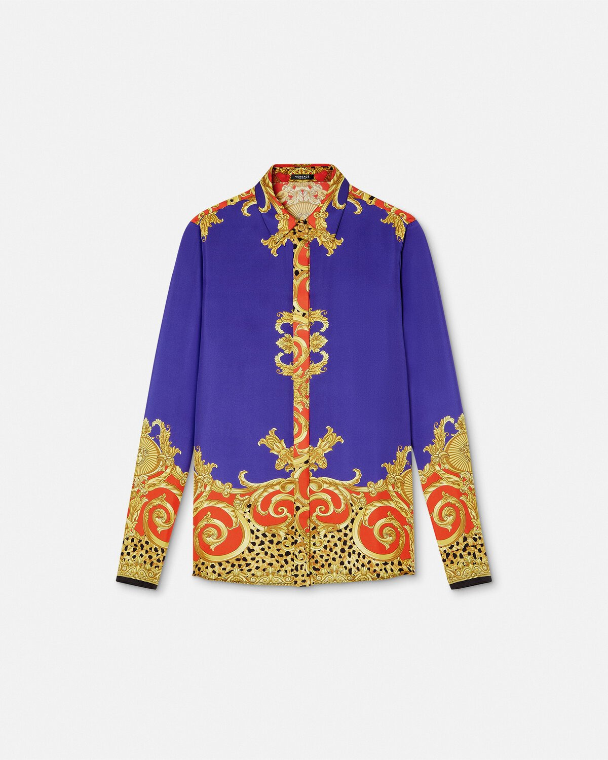 DETAILS This classic longsleeved shirt is made from silk twill and features an animalier print with Barocco motifs and a single accent Medusa button at the front closure - Cheetah Barocco Rock 'n' Royalty print - Medusa hardware - Long sleeves - Pointed collar - Concealed button closure - Buttoned cuffs - Outer Composition: 100% Silk Item: 1001360-1A16367_5UH20 SIZE & FIT - The model is 5'10" / 1.78 m tall and wears size 38 IT