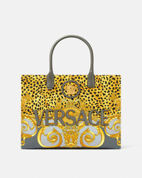 Crafted from canvas with leather top handles, this spacious tote bag features an all-over Cheetah Foulard print and is detailed with a front three-dimensional La Medusa hardware. It showcases a leather raised Versace Logo lettering, two zipped pockets, and a leather protector strap. The front D-ring provides an optional attachment for keychain or charm. - Cheetah Foulard print - La Medusa hardware - Versace Logo lettering - Double top handles - Two internal zip pockets - Leather feet - Outer Composition: 100% Cotton - Lining: 100% Cotton - Trim: 100% Calf Leather Size & Fit - L15.7 x W6.3 x H11.8" / L40 x W16 x H30 cm - Handle drop: L6.3" / L16 cm - Approximate weight: 38.8 oz / 1.1 kg Item: 1004741-1A16237_DTU_UNICA_5E71V__