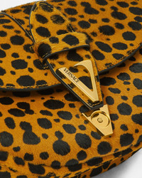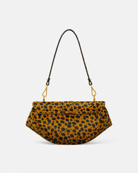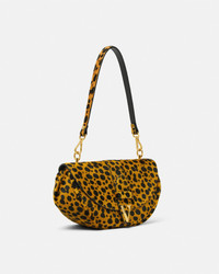 The Virtus shoulder bag, a tribute to Versace's signature iconography, is shaped in a contemporary semi-circular silhouette and made from pony-effect calf hair in a Cheetah Allover pattern. The foldover flap is adorned with a striking 'V' emblem and an enamel-engraved Versace Logo. The detachable top handle is further embellished with Medusa stud accents. - Cheetah Allover pattern - V hardware - Versace Logo engraving - Detachable top handle - Foldover flap with magnetic closure - Interior slip pocket - Outer Composition: 100% Calf Hair - Lining: 100% Cotton - Trim: 100% Calf Leather Size & Fit - L13.8 x W4.5 x H7.1" / L35 x W11.5 x H18 cm - Handle drop: 9.8" / 25 cm - Approximate weight: 17.7 oz / 0.5 kg Item: 1020088-1A16318_DTU_UNICA_2KU7V__