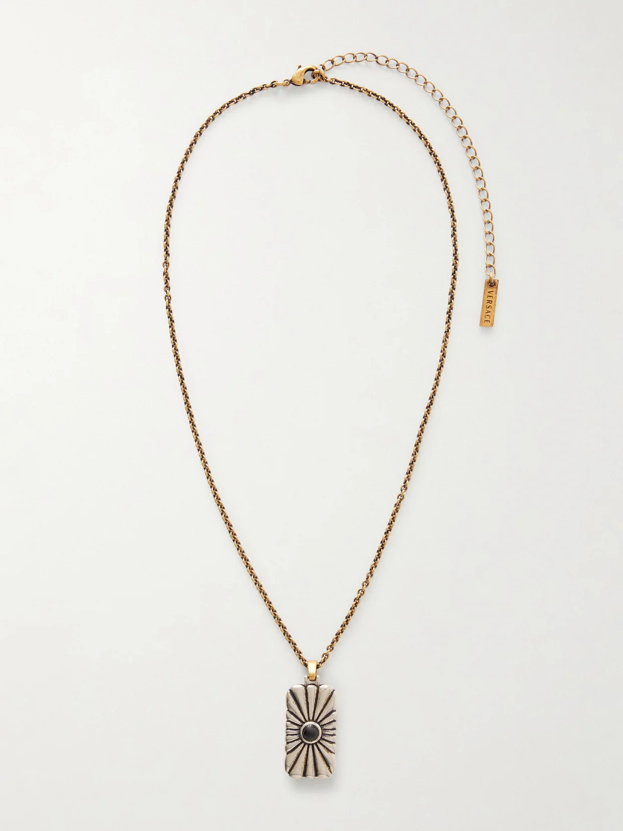 Versace crafts the 'Circe' necklace from gold- and silver-tone metal, engraved with a sunburst motif for a subtle retro feel. A black cabochon sits at the center, with the house's 'Medusa' emblem at the reverse. Wear it to add interest to everyday looks.