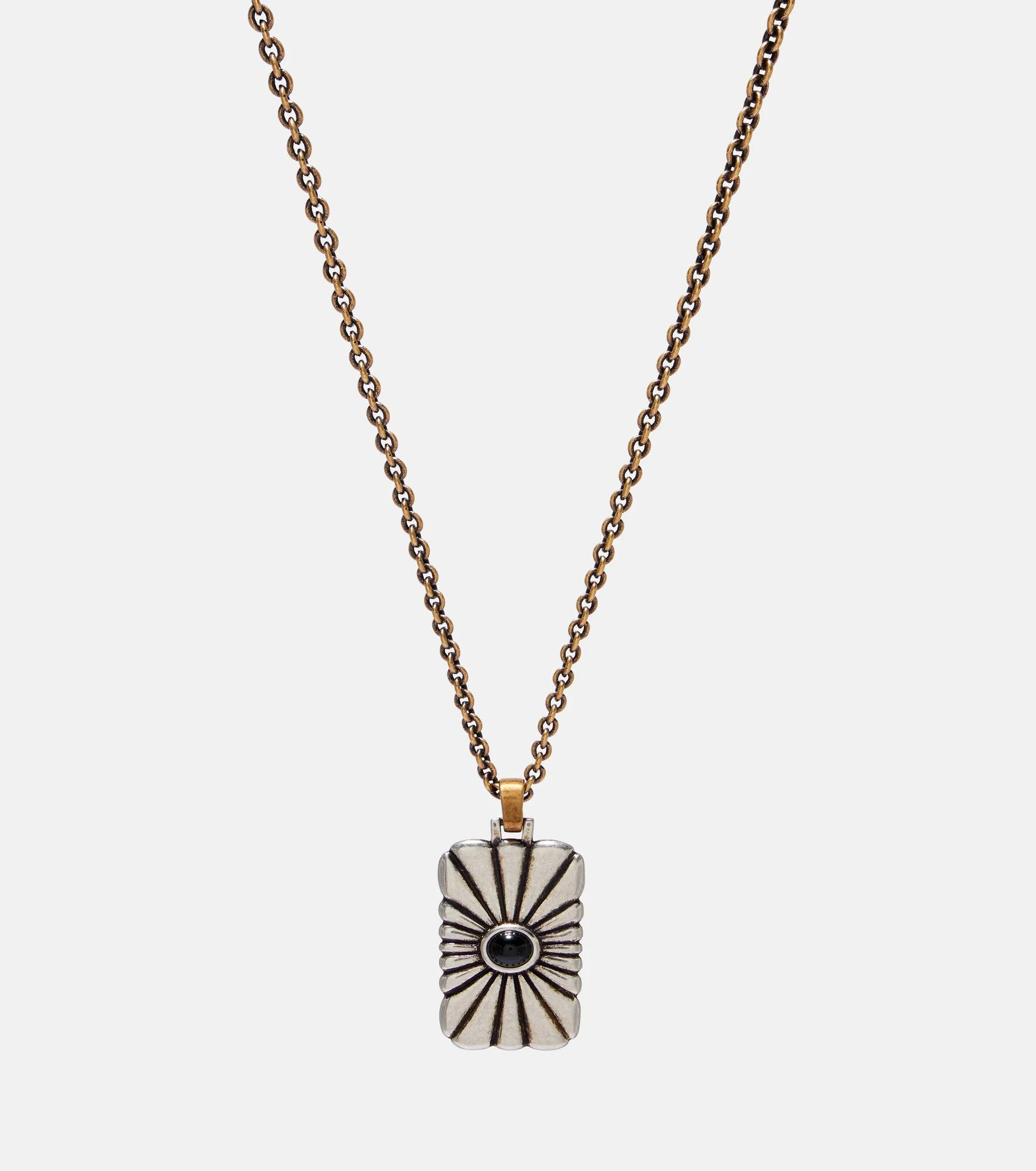 The Circe necklace from Versace showcases a sleek rectangular silhouette engraved with a radiant sunray motif. Finished with an antique-inspired aesthetic, the design is accented by a cabochon-cut colored glass stone at the centre. Product Details - Material: brass - Made in Italy - Includes: box - Color: gold - Stone I: cabochon-cut - Item number: P01152532 Size & Fit - Length when open 44,5/54,5cm-17.5/21.5" - Width 0,2cm-0" - Pendant length 3,6cm-1.5" - Pendant width 1,6cm-0.5"