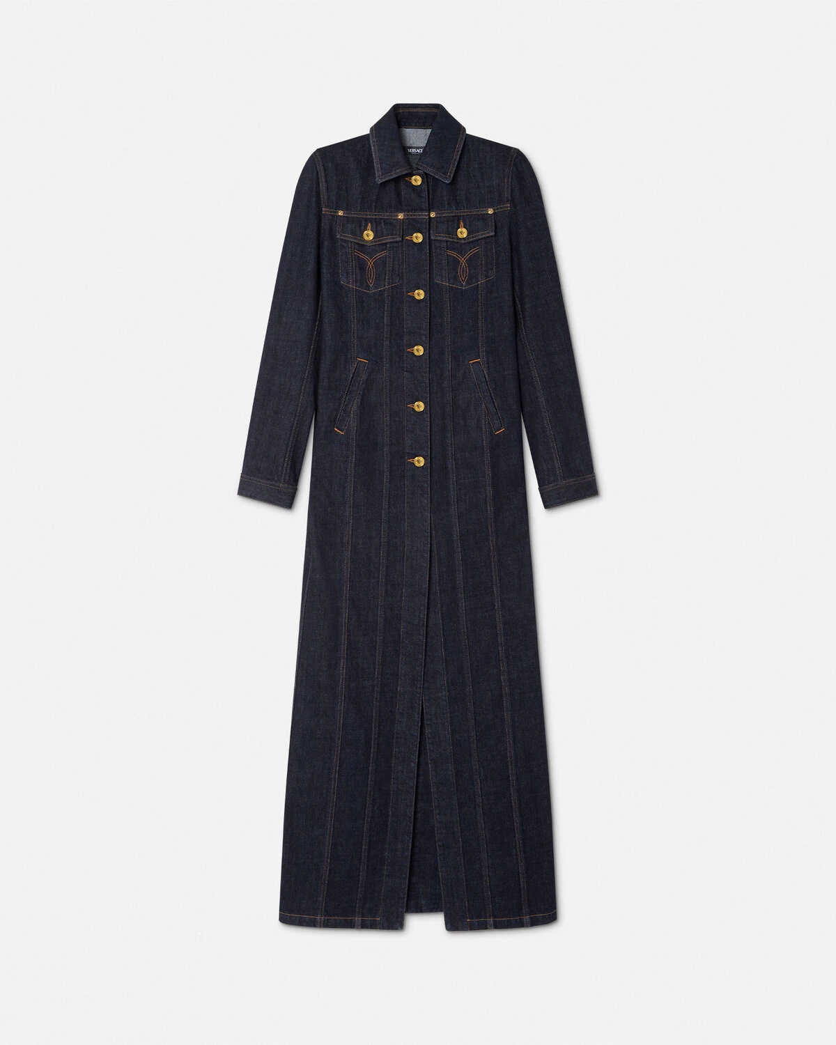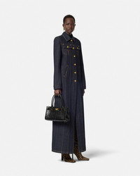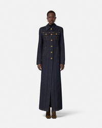 DETAILS A long singlebreasted coat crafted from cotton denim in a darkwashed finish featuring a structured silhouette with padded shoulders The design is accented by Medusa buttons and a Medusa 95 detail at the back - Medusa hardware - Medusa '95 hardware - Long sleeves - Pointed collar - Front button closure - Chest flap pockets - Side pockets - Buttoned cuffs - Back vent - Outer composition: 100% Cotton Item: 1017265-1A12294_1D100 SIZE & FIT - The model is 5'9" / 1.80 m tall and wears size 38 IT