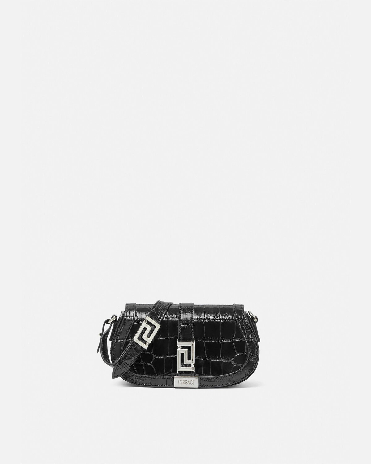 DETAILS The Greca Goddess line is characterized by the central Greca chain hardware. Crafted in Italy from croc-effect embossed leather, it features a spacious interior with an additional slip compartment. A leather strap can be adjusted for shoulder or hand-carry options. - Greca hardware - Detachable and adjustable leather shoulder strap - Magnetic snap button closure - Foldover flap - Internal slip compartment - Outer composition: 100% Calf leather - Lining: 100% Lambskin Item: 1010951-1A08724_DTU_UNICA_1B00P__ SIZE & FIT - L8.2" x W2.8" x H4.5" - Strap: L7.1"-8.7" - Drop: L7.9"