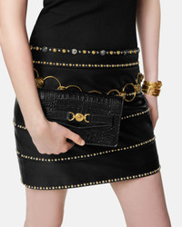 An embossed croc-effect calf leather clutch featuring a Medusa '95 hardware at the front, multiple interior card slots, a spacious slip pocket and a zipped pocket. The accessory has a thin removable chain strap for optional crossbody wear. - Medusa '95 hardware - Magnetic closure - 6 card slots - Slip pocket - Zipped pocket - Detachable chain strap - Outer Composition: 100% Calf Leather - Lining: 60% Cotton, 40% Viscose - Trim: 100% Lambskin Size & Fit - L7.7 x W1.6 x H4.5" / L19.5 x W4 x H11.5 cm - Shoulder strap: L40.9" / L104 cm - Shoulder strap drop: L19.7" / L50 cm - Approximate weight: 10.6 oz / 0.3 kg Item: 1020075-1A08724_DTU_UNICA_1B00V__