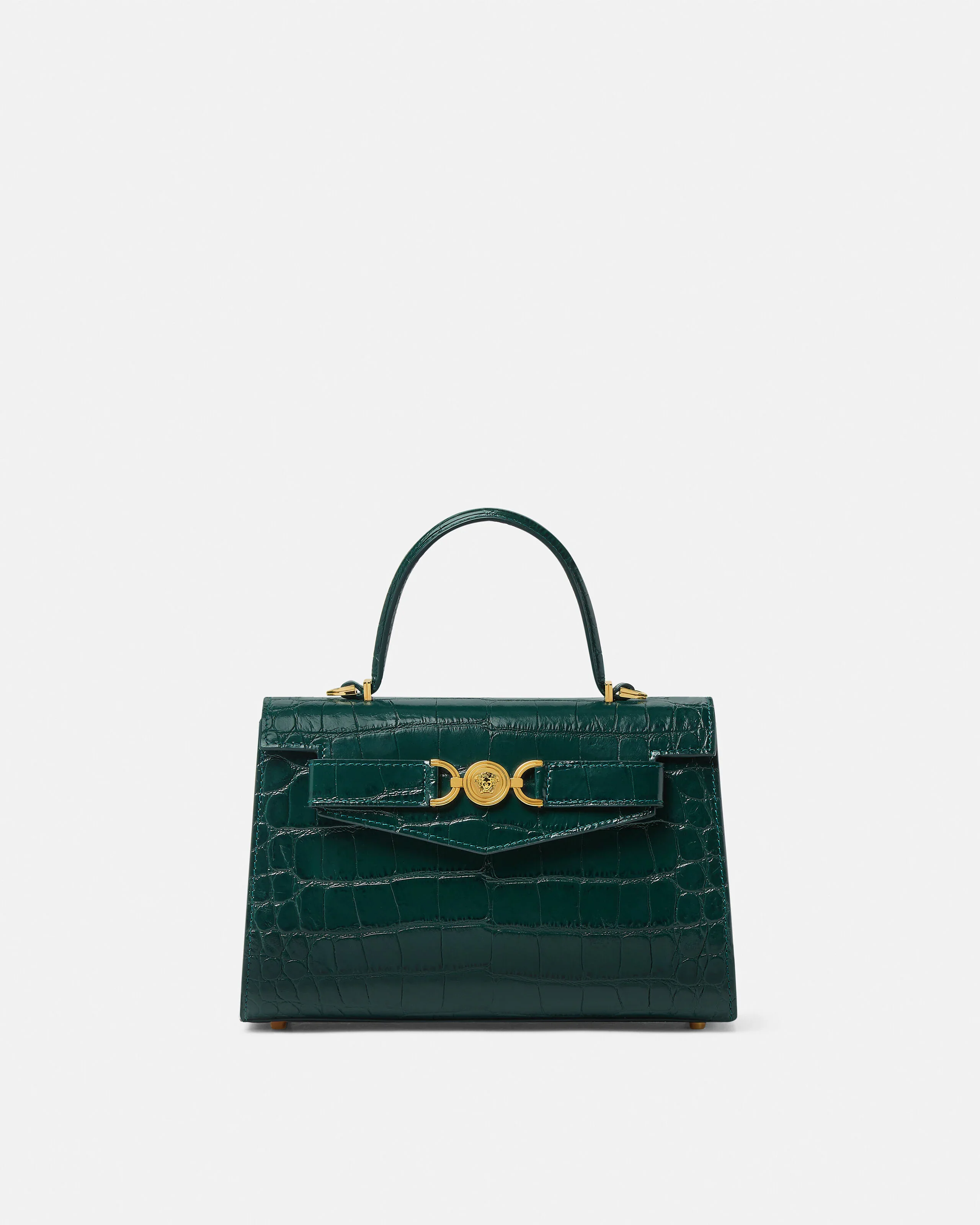 A medium-sized handbag with a belt detailing featuring the Medusa '95 hardware, the iconic House code first seen in the 1995 collections. The top handle design is made from croc-effect embossed leather with a magnetic foldover flap and a detachable crossbody shoulder strap. - Medusa '95 hardware - Versace logo - Top handle - Foldover magnetic closure - Two internal slip pockets - Adjustable and detachable shoulder strap - Metal feet - Outer composition: 100% Calf leather - Lining: 100% Lambskin Size & Fit - L10.2 x W3.3 x H7.5" / L26 x W8.5 x H19 cm - Strap:L42.5-45.7" / L108-116 cm - Drop: L3.7" / L9.5 cm - Approximate weight: 21.2 oz / 0.6 kg Item: 1013823-1A08724_DTU_UNICA_1GJ1V__