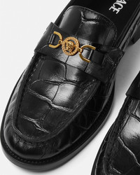DETAILS These slip-on patent leather loafers have a crocodile embossed finish and the Medusa '95 detail at the penny strap—a House signifier that first debuted in the mid-'90s. - Medusa '95 hardware - Slip on - Round toe - Penny strap - Flat stacked heel - Lining 1: 100% Goat leather - Lining 2: 100% Lambskin - Outer composition: 100% Calf leather - Sole: 100% Calf leather Item: 1012123-1A08910_1B00V SIZE & FIT - The shoe weighs 10.6 oz for the model size 37 - All sizes fit Italian standards - Fits true to size, take your normal size - Heel: 0.8"