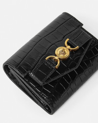 DETAILS A trifold wallet crafted from croc-effect embossed leather accented by a Medusa '95 belt hardware at the front and featuring multiple internal card slots, a note compartment, and a zipped coin pouch. - Medusa '95 hardware - Versace logo embossing - Interior card slots - Note compartment - Zipped coin pouch - Snap-button closure - Trifold design - Outer composition: 100% Calf leather - Lining: 60% Cotton, 40% Viscose - Trim: 100% Lambskin Item: 1014689-1A08724_DTU_UNICA_1B00V__ SIZE & FIT - Open: L10.8 x W0.6 x H4.9" / L27.5 x W1.5 x H12.5 cm - Closed: L4.9 x W1.2 x H3.9" / L12.5 x W3 x H10 cm - Approximate weight: 3.5 oz / 0.1 kg