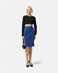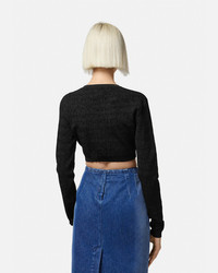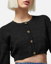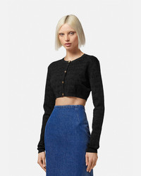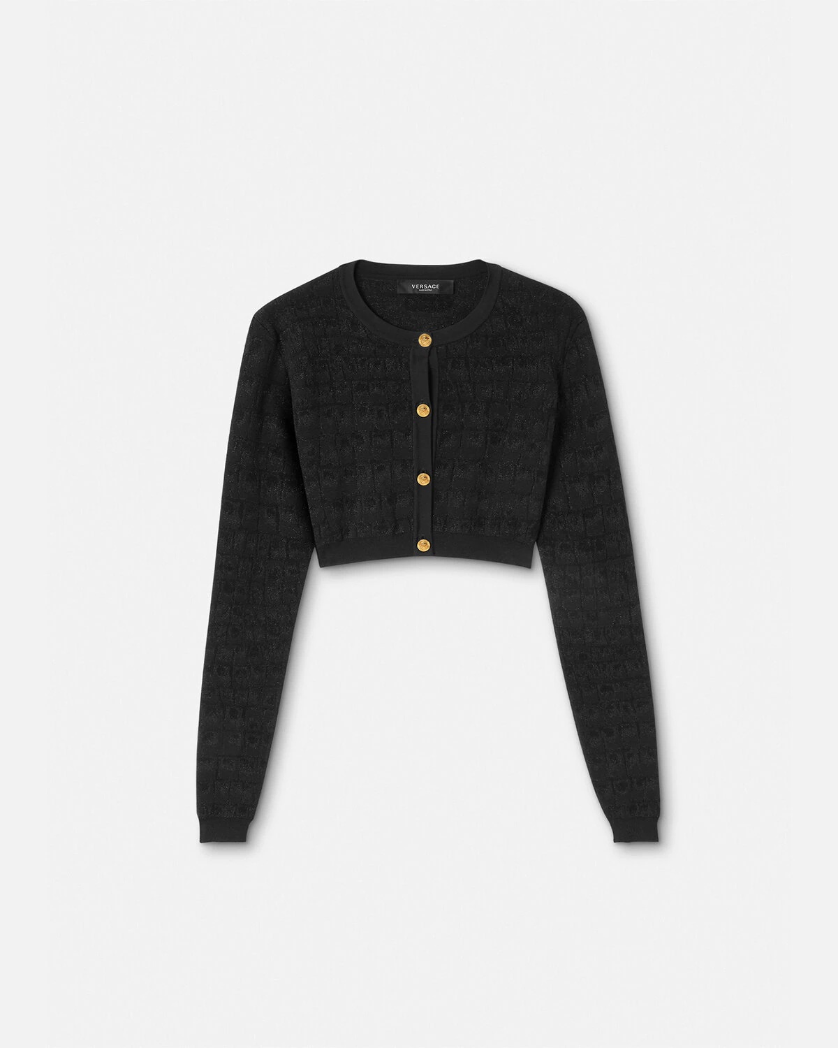 DETAILS A knit cropped cardigan with a tonal jacquard crocodile pattern in lurex threading and accent Medusa buttons - Medusa hardware - Long sleeves - Crewneck - Front button closure - Ribbed trims - Outer composition: 82% Viscose, 8% Nylon, 7% Metallised Polyester, 3% Elastane Item: 1011020-1A08878_1B000 SIZE & FIT - The model is 5'10" tall and wears size 38 - All sizes fit Italian standards