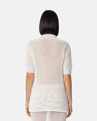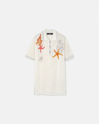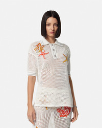 DETAILS This crochet-knit cotton polo shirt is detailed with coral, seashell, and starfish embroideries at the front, accented by Medusa hardware. - Coral, seashell, and starfish embroideries - Short sleeves - Pointed collar - Three-button placket - Outer composition: 100% Cotton - Embroidery: 98% Polyester, 2% Viscose - Trim: 100% Polyester Item: 1015662-1A11020_1W470 SIZE & FIT - The model is 5'10" tall and wears size 38 IT