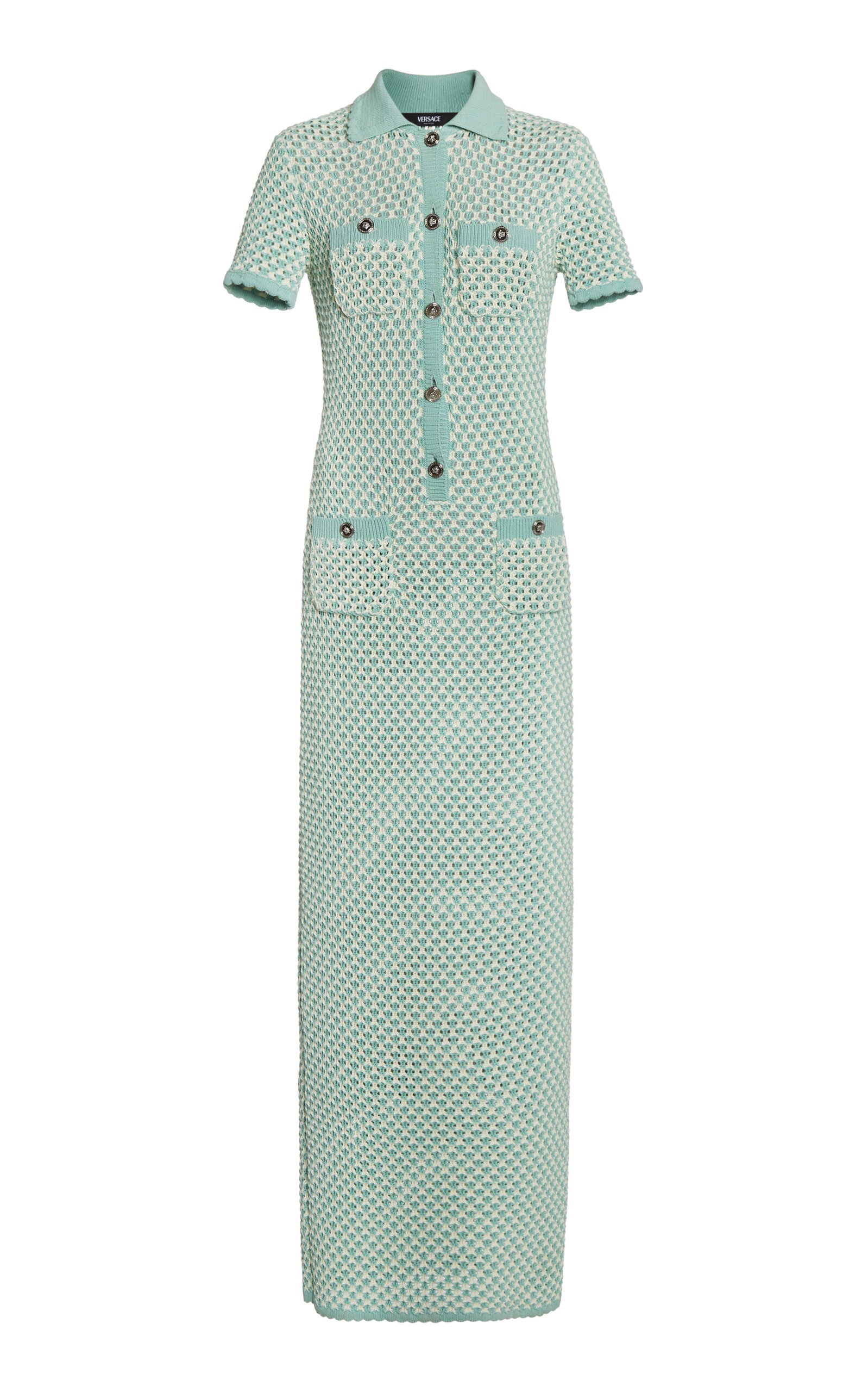 The Spring '25 collection makes joy its driving force in a free profusion of energy fueled by the savoir-faire at the heart of the House. Hand-crocheted with a compact weave, this midi dress features a posh design with a polo neckline and front pockets. PRODUCT DETAILS - Spring/Summer '25 - Partial button fastening through front - Composition: 68% cotton, 32% polyamide - Designer color: Eggshell/Sea Green - Dry clean only - Made in Italy SIZE & FIT - Designed for a slim fit