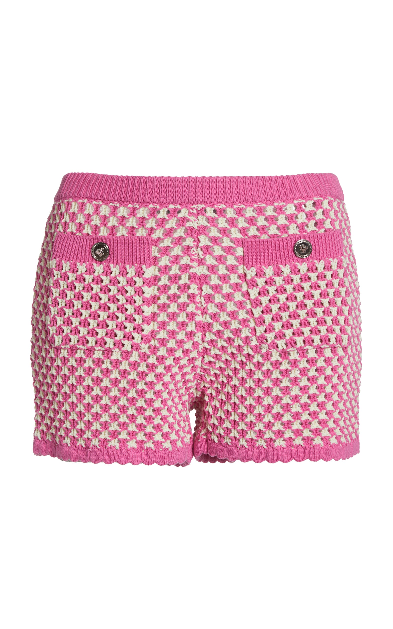 The Spring '25 collection makes joy its driving force in a free profusion of energy fueled by the savoir-faire at the heart of the House. These posh mini shorts have been hand-crocheted with a compact weave and trimmed with rib. PRODUCT DETAILS - Spring/Summer '25 - Pull on - Composition: 67% cotton, 32% polyamide, 1% elastane - Designer color: Eggshell/Guava - Dry clean only - Made in Italy SIZE & FIT - Designed for a slim fit
