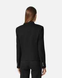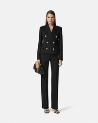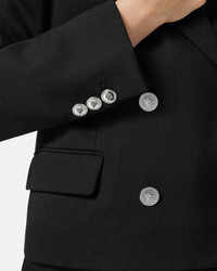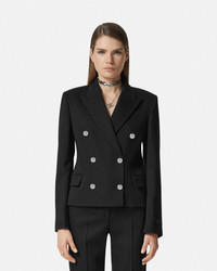 DETAILS This cropped doublebreasted blazer in stretch grain de poudre wool has sharp padded shoulders and accent Medusa buttons The sartorial style has peaked lapels and a tonal jacquard Versace tailoring label on the sleeve - Medusa hardware - Tailoring label - Long sleeves - Peaked lapels - Front button closure - Chest welt pocket - Front flap pockets - Buttoned cuffs - Outer composition: 98% Pure virgin wool, 2% Elastane - Lining: 100% Cupro Item: 1017677-1A12258_1B000 SIZE & FIT - The model is 5'10" / 1.79 m tall and wears size 38 IT