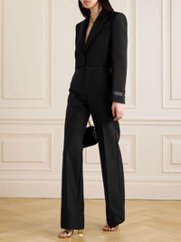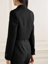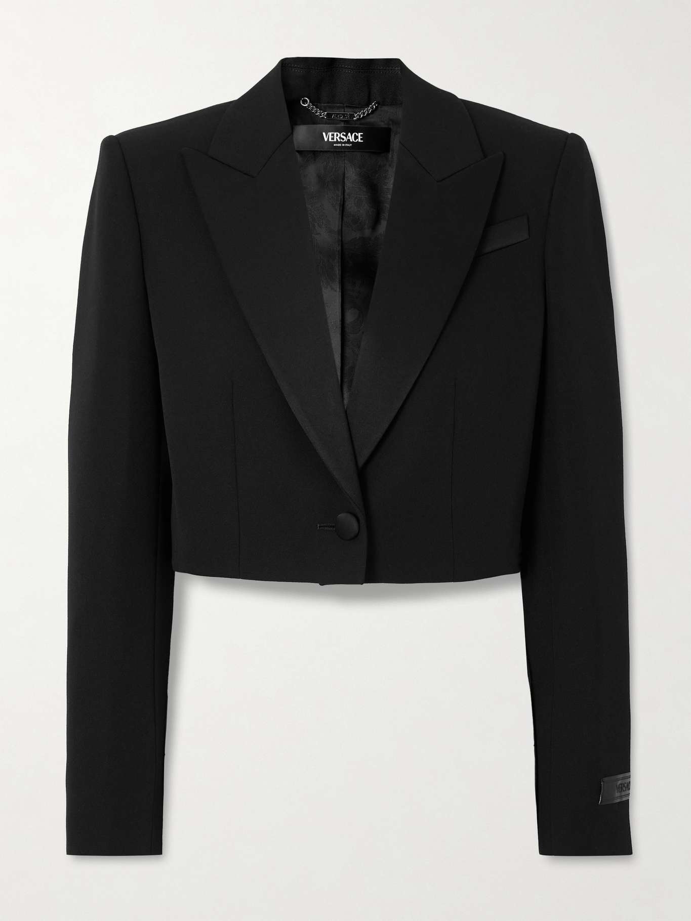 EDITORS'NOTES Super sharp tailoring is a key theme in Versace's Pre-Fall '24 collection. Made from grain de poudre wool, this blazer takes cues from classic tuxedos with satin-trimmed peak lapels and a single button close. Styled with a pencil skirt or slim pants, it makes such a chic alternative to a dress for your next big event. SIZE & FIT Model measurements: - Fits true to size, take your normal size - Designed for a slightly loose fit - Internal shoulder pads - Cropped length - Mid-weight, non-stretchy fabric - Model is 175cm/ 5'9" and is wearing an IT 40 - Bust: 81cm/ 32" - Waist: 65cm/ 25.5" - Hip: 92cm/ 36" DETAILS & CARE - Black grain de poudre wool and satin - Button fastening at front - 100% wool; trim: 78% silk, 22% polyester; lining: 58% cupro, 42% viscose - Dry clean