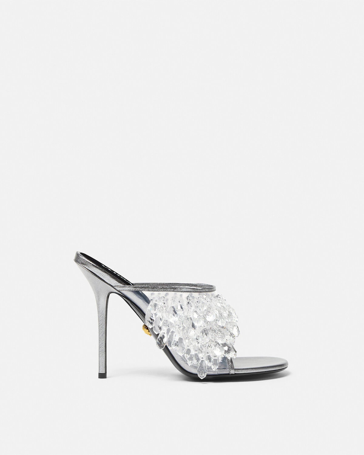DETAILS These high stiletto mules have a metallic leather finish with a round toe detailed with chandelier crystals on transparent uppers - Crystal embellishments - Round toe - Stiletto heel - Outer composition: 55% Polyvinylchloride, 45% Lambskin - Lining 1: 100% Goat leather - Lining 2: 100% Polyvinylchloride - Sole: 100% Calf leather Item: 1011804-1A08974_1X31V SIZE & FIT - The shoe weighs 10.6 oz for the model size 38 - All sizes fit Italian standards - Fits true to size, take your normal size - Heel: 4.5"