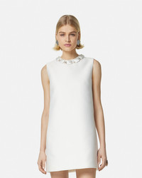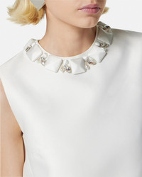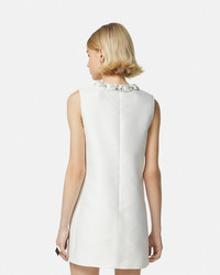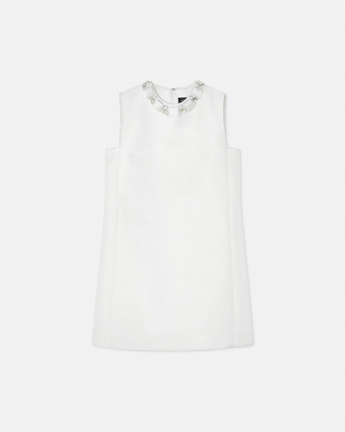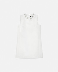 DETAILS A sleeveless shift mini dress crafted from blended double silk duchesse with geometric satin-covered embroideries including bead and drop, pearl embellishments at the neckline. - Bead and pearl embroidery - Sleeveless - Round neckline - Back zip closure - Outer composition: 65% Polyester, 35% Silk - Lining: 74% Viscose, 26% Polyester Item: 1015006-1A10598_1W010 SIZE & FIT - The model is 5'10" tall and wears size 38 - All sizes fit Italian standards