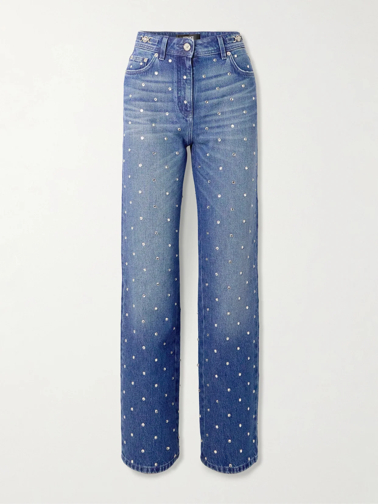Versace's jeans are dusted with crystals for a glamorous touch of sparkle. Made from faded denim, they have a mid-rise waist and fall to straight legs that hit just below the ankles. Match your accessories to the silver-tone hardware.