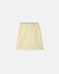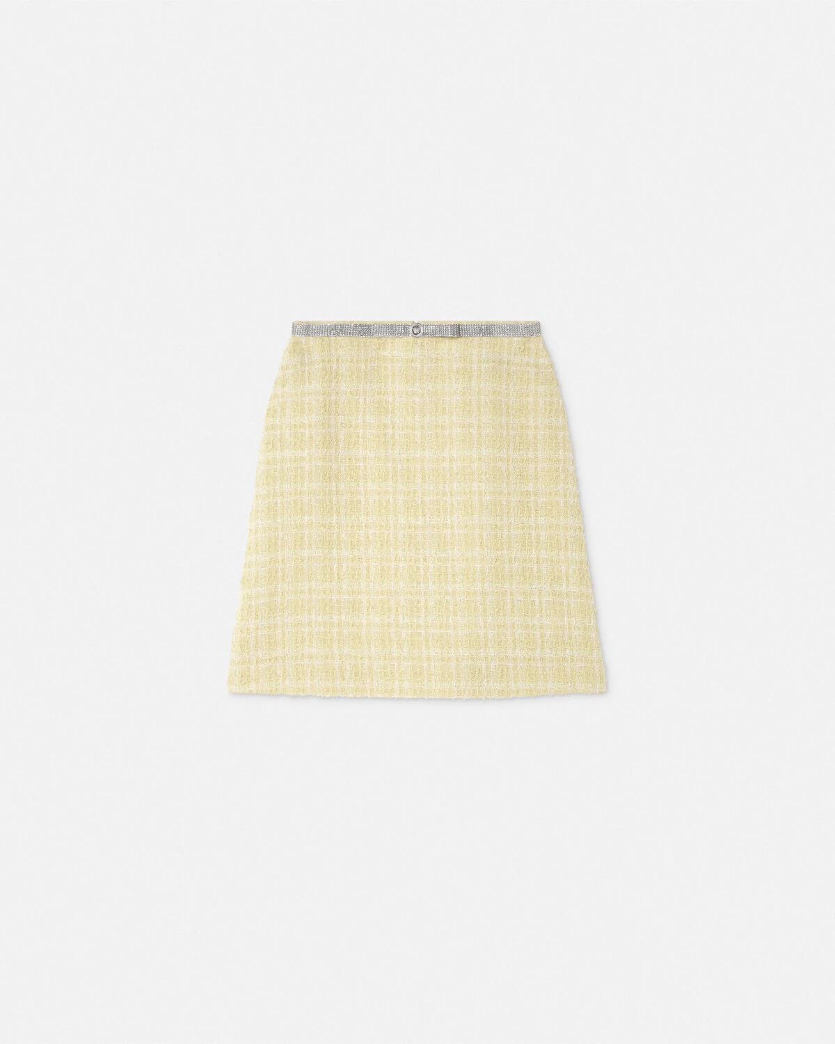 DETAILS An Aline mini skirt in a blend cotton tweed featuring a crystalembellished metal mesh Gianni Ribbon bow and trim at the waist The style is fully lined in twill - Gianni Ribbon bow - Medusa hardware - Crystal embellishments - Concealed back zip closure - Outer composition: 70% Cotton, 15% Nylon, 13% Viscose, 2% Linen - Inner composition: 74% Acetate, 26% Viscose - Lining: 100% Cupro - Trim: 100% Metal Item: 1021186-1A15389_1YD20