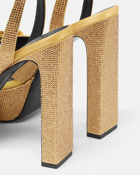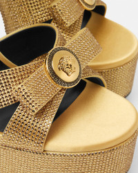 DETAILS These satin platform sandals are set on slim highblock heels with allover tonal crystal embellishments The upper straps are accented by a Gianni Ribbon bow featuring an enamel Medusa emblem at its center - Gianni Ribbon bow - Medusa hardware - Round open toe - Buckle ankle strap - Slim block heel - Platform - Outer composition: 71% Viscose, 27% Silk, 2% Lambskin - Lining 1: 100% Goat leather - Lining 2: 100% Lambskin - Sole: 100% Calf leather Item: 1017314-1A15718_1Y83V SIZE & FIT - The shoe weighs approximately 17.7 oz / 0.5 kg for the model size 37 IT - Heel: 5.5" / 14 cm - Platform: 1.6" / 4 cm - Footbed: regular - Fits true to size, take your normal size