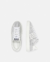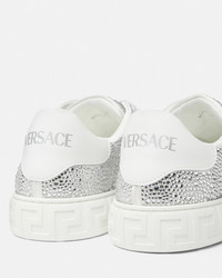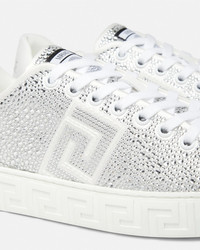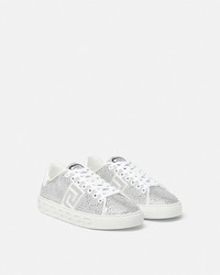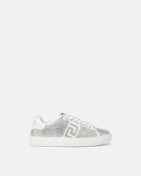 DETAILS Lowtop trainers featuring allover crystal embellishments on the uppers The laceup style has an engraved Greca pattern on the soles and a back leather logo patch - Greca motif - Crystal embellishments - Low-top - Lace-up - Versace logo patch on tongue - Versace logo on heel counter - Outer composition: 72% Viscose, 28% Silk - Lining: 100% Polyester - Trim: 100% Nylon - Sole: 100% Thermoplastic polyurethane Item: 1013568-1A12465_2W020 SIZE & FIT - Footbed: regular - Fit is true to size, we recommend taking your normal size