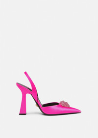 Effortlessly elegant, these slingbacks are crafted from smooth satin. The sleek pointed toe silhouette is adorned with a fully crystal-encrusted Medusa plaque – the iconic décor found on the doors of the brand's first headquarters in Milan. DETAILS & CARE - Crystal La Medusa plaque - Pointed toe - High heel - Belt fastening on heel - Upper: 72% Viscose 28% Silk - Insole: 100% Goat leather - Sole: 100% Calf leather - Made in Italy SIZE & FIT - Height: 10,5cm - All sizes fit Italian standards - Fits true to size, take your normal size