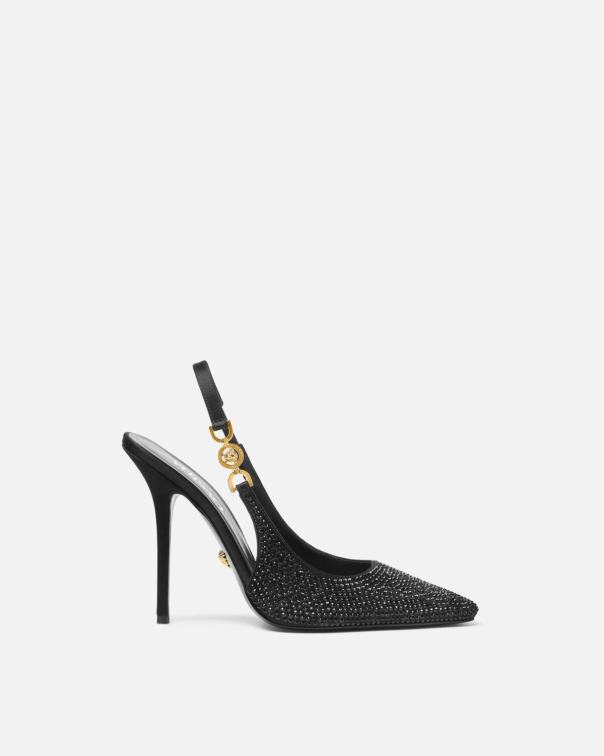 DETAILS These crystal-embellished high-heel pumps have satin uppers with a squared toe and a Medusa '95 emblem at the slingback strap. - Medusa '95 hardware - Crystal embellishments - Square toe - Stiletto heel - Outer composition: 72% Viscose, 28% Silk - Lining 1: 100% Lambskin - Lining 2: 100% Goat leather - Sole: 100% Calf leather - Trim: 100% Lambskin Item: 1012127-1A00868_1B00V SIZE & FIT - The shoe weighs approximately 7 oz / 0.2 kg for the model size 37 IT - Heel: 4.3" / 11 cm