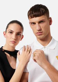 In Versace's signature Greca design, this wide-band ring features Swarovski crystals and the Medusa emblem at the center. All Versace jewelry products are lead and nickel free. All materials are hypoallergenic. DETAILS & CARE - Metal: Brass - Finish: Versace Gold + Crystal - Please note water and perfume may damage the item - Made in Italy