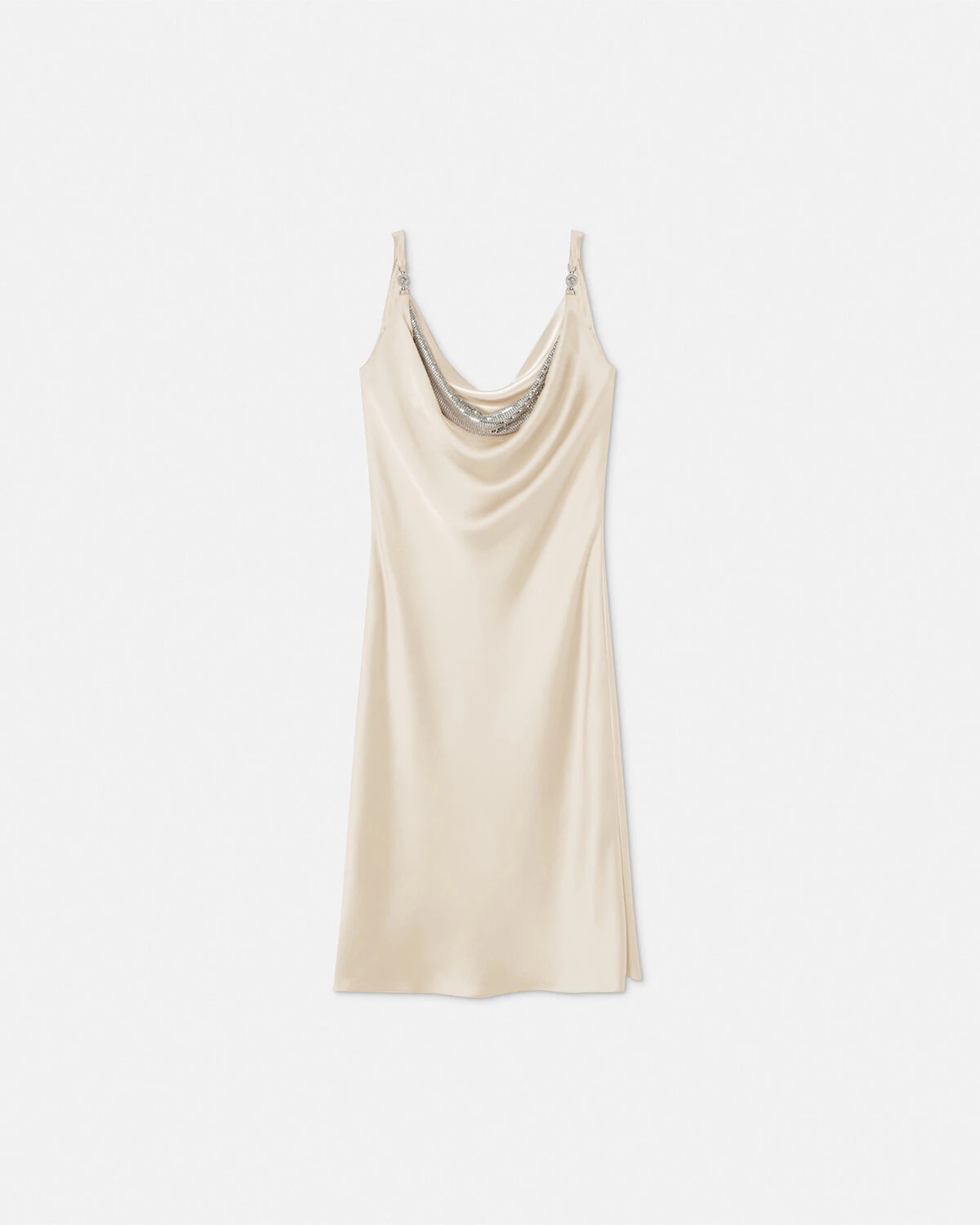 DETAILS A satineffect midi dress accented by Medusa 95 hardware on the shoulder straps and a signature metal mesh draped trim on the cowl neckline - Medusa '95 hardware - Sleeveless - Slip on - Outer composition: 100% Polyester - Lining: 100% Polyester - Trim: 100% Metal Item: 1018071-1A12921_1KJ00 SIZE & FIT - The model is 5'10" / 1.79 m tall and wears size 38 IT