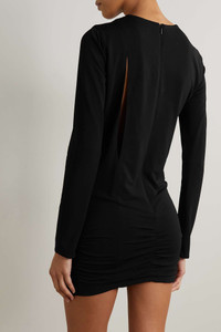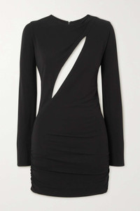 EDITORS'NOTES Our buyers are loving cutout dresses this season, and this Versace mini dress is already a highlight. Worn on the Spring '23 runway, it's made from smoothing stretch-jersey that's gathered throughout the body and spliced dramatically across the front and back. Mirror the show styling and wear yours with knee boots or patent pumps. SIZE & FIT - Fits large to size, take one size smaller than normal - Designed for a close fit - Mid-weight, stretchy fabric - Model is 177cm/ 5'10" and is wearing an IT 38 DETAILS & CARE - Black stretch-jersey - Concealed zip fastening along back - 95% viscose, 5% elastane - Dry clean Large to size. See Size & Fit notes.
