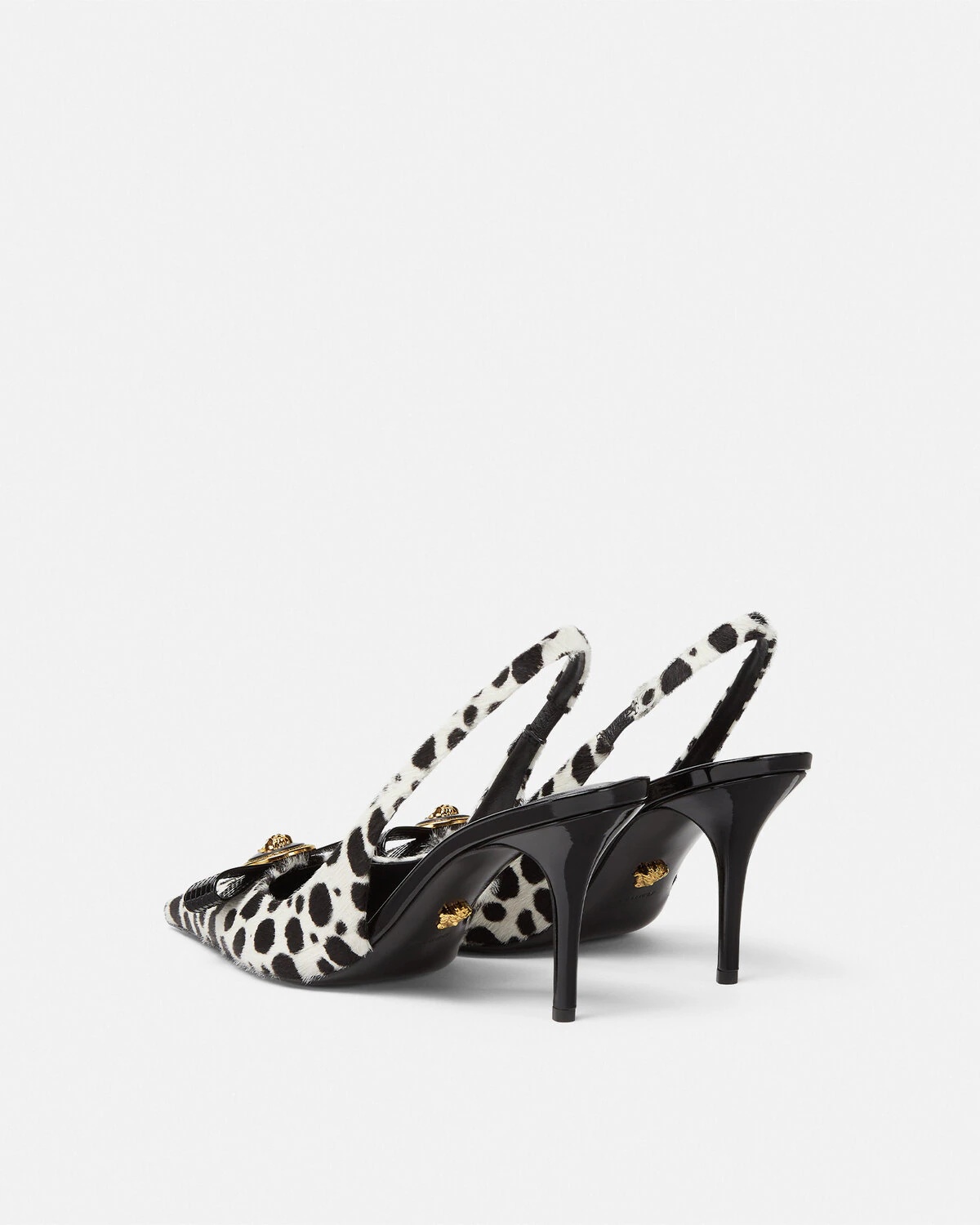 DETAILS These slingback pumps in a ponyeffect calf hair Dalmatian pattern have sharppointed toes featuring stiletto heels and the signature nastro Gianni bow in patent leather with a central enamel Medusa hardware - Dalmatian print - Medusa hardware - Pointed toe - Slingback strap - Stiletto heels - Outer composition: 100% Calf hair - Lining 1: 100% Lambskin - Lining 2: 100% Goat leather - Sole: 100% Calf leather - Trim: 100% Calf leather Item: 1013717-1A13303_2W02V SIZE & FIT - The shoe weighs 10.6 oz / 0.3 kg for the model size 39 IT - Heel: 3.3" / 8.5 cm