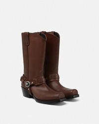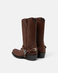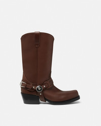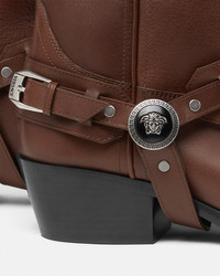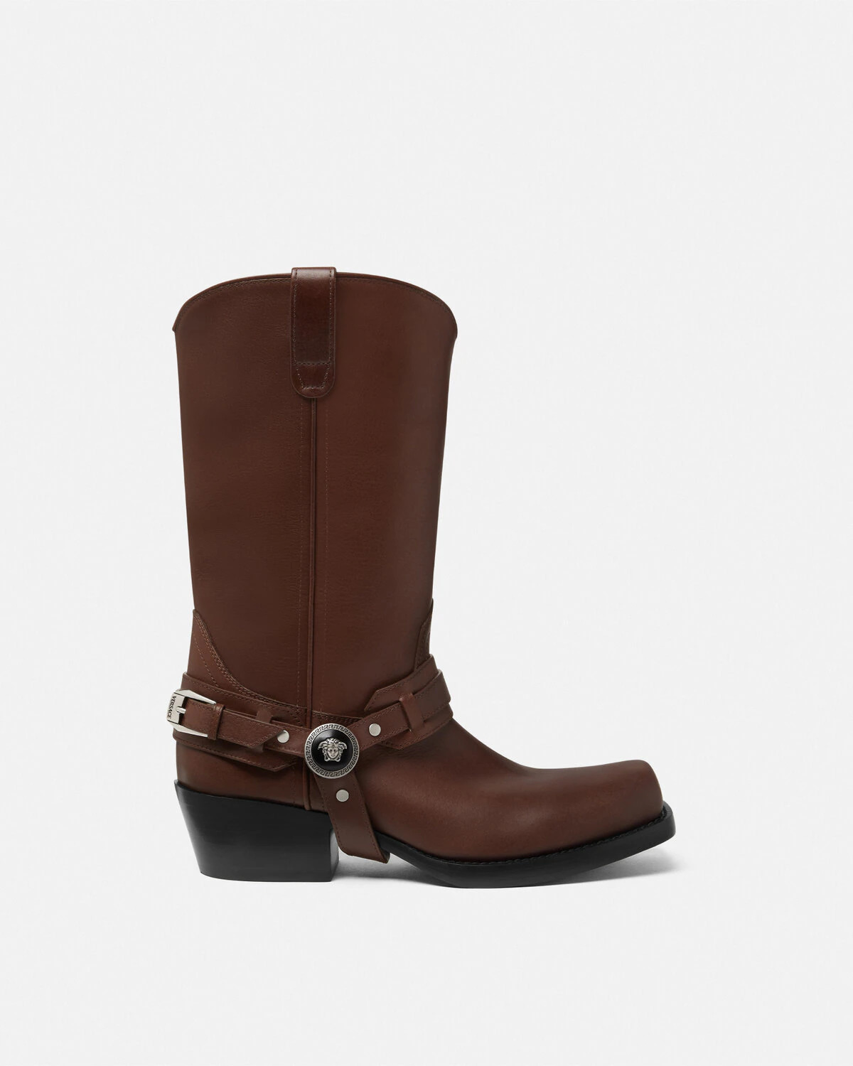 DETAILS These Westerninspired boots in smooth calf leather are characterized by a squared toe and detachable gaiters with a matte enamel Medusa emblem - Medusa hardware - Adjustable and detachable gaiters - Squared toe - Side pull tabs - Slanted block heel - Slip on - Outer composition: 100% Calf leather - Lining 1: 100% Goat leather - Lining 2: 100% Lambskin - Sole: 100% Calf leather Item: 1020048-1A12155_1ND3I SIZE & FIT - The shoe weighs approximately 24.7 oz / 0.7 kg for the model size 40 IT - Footbed: comfortable - Fits true to size, take your normal size - Heel: 2" / 5 cm