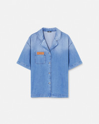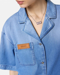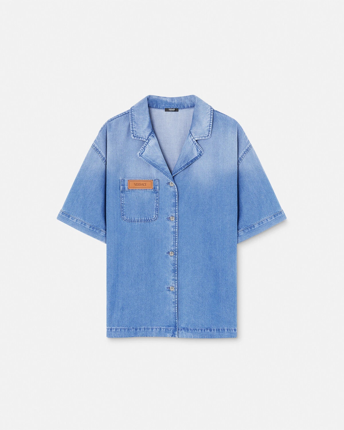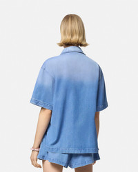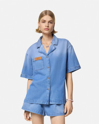 DETAILS This lightweight stonewashed denim shirt in a pajama-inspired style is detailed by a Versace logo leather patch at the chest pocket, and accent Medusa hardware. - Medusa hardware - Versace logo leather patch - Short sleeves - Notched collar - Front button closure - Chest patch pocket - Side slits - Outer composition: 100% Cotton - Trim: 100% Calf leather Item: 1016268-1A07079_1D030 SIZE & FIT - The model is 5'10" tall and wears size 38 IT