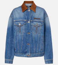 The Trucker denim jacket features logo embroidery at the chest, a contrasting suede peak collar, and Medusa buttons. Inspired by Greek mythology, the Medusa head has become the ultimate signifier of the house of Versace. Product Details - Material: 100% cotton - Care instructions: machine wash at 30 degrees - Made in Italy - Color: blue - Designer color name: Medium Blue - Embroidery: 100% polyester - Trim: 100% lamb leather (suede) - Hardware color: silver - Collar: classic (Straight point) - Cuff: buttoned - Pockets: flap chest pockets, welt pockets - Closure: buttoned front - Adjustable tabs at the waist - Item number: P01129260 Size & Fit - True to size - Dropped shoulders - Designed for a loose fit - Non-stretchy fabric - Falls below the hip - The model seen in the picture is 178cm-5'10" and wearing a size IT 40